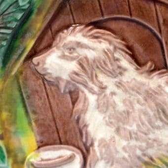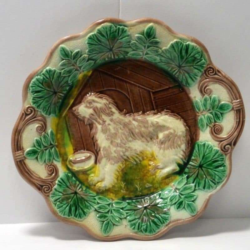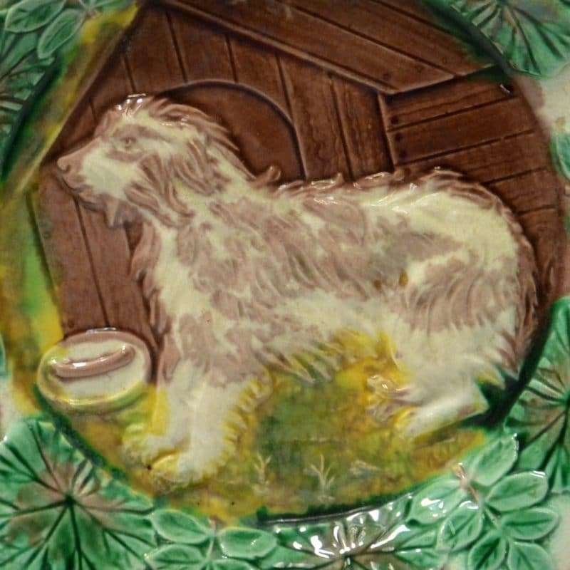 This large Majolica plate shows a resting spaniel dog, in high relief, with a backdrop of his dog house. This plate measures a full 11 1/4 inches in diameter, and it is in excellent, flawless condition.