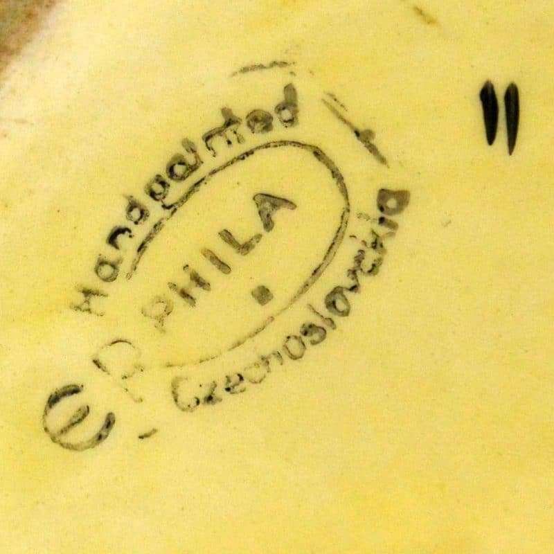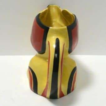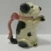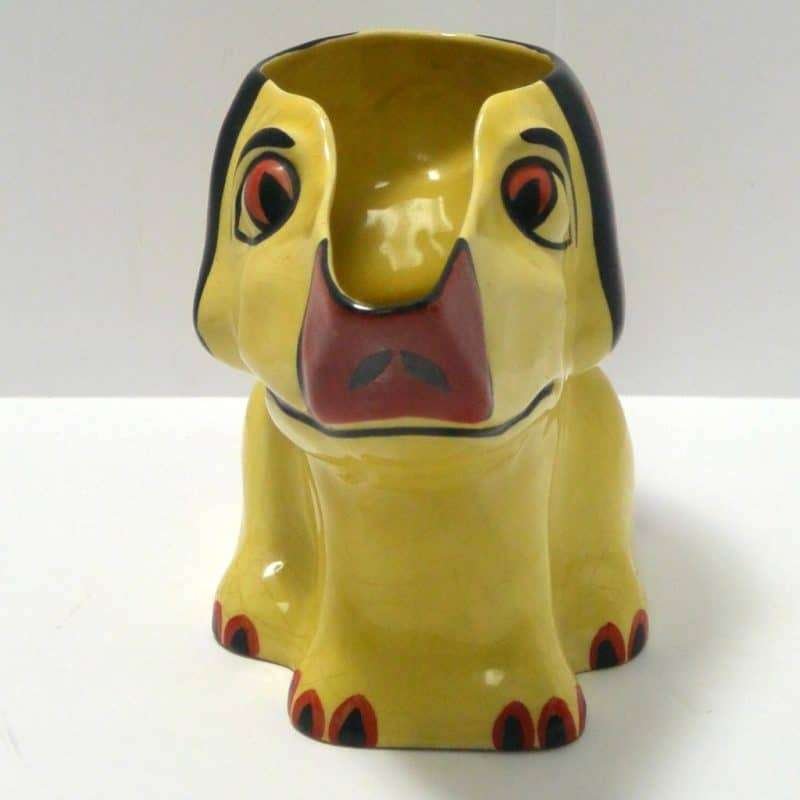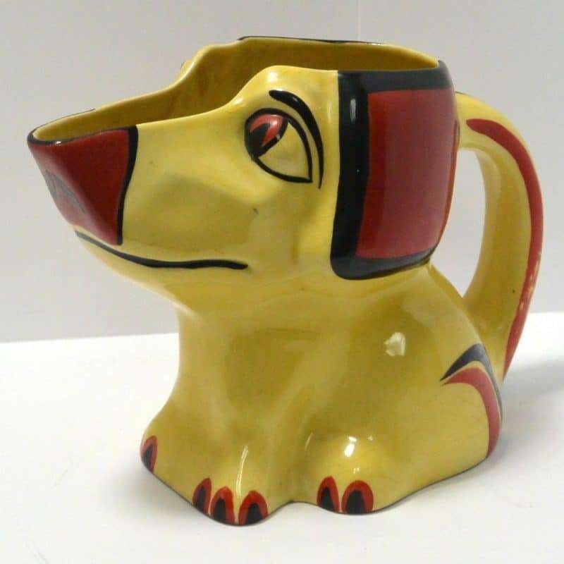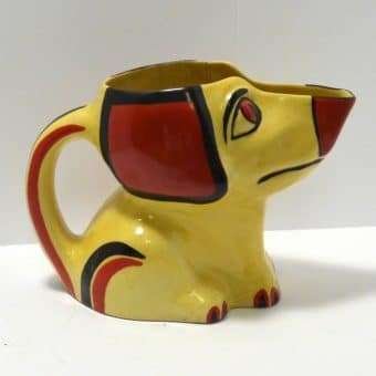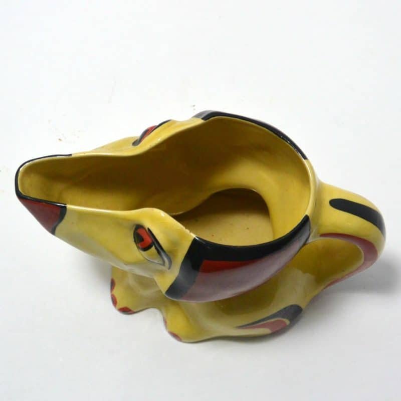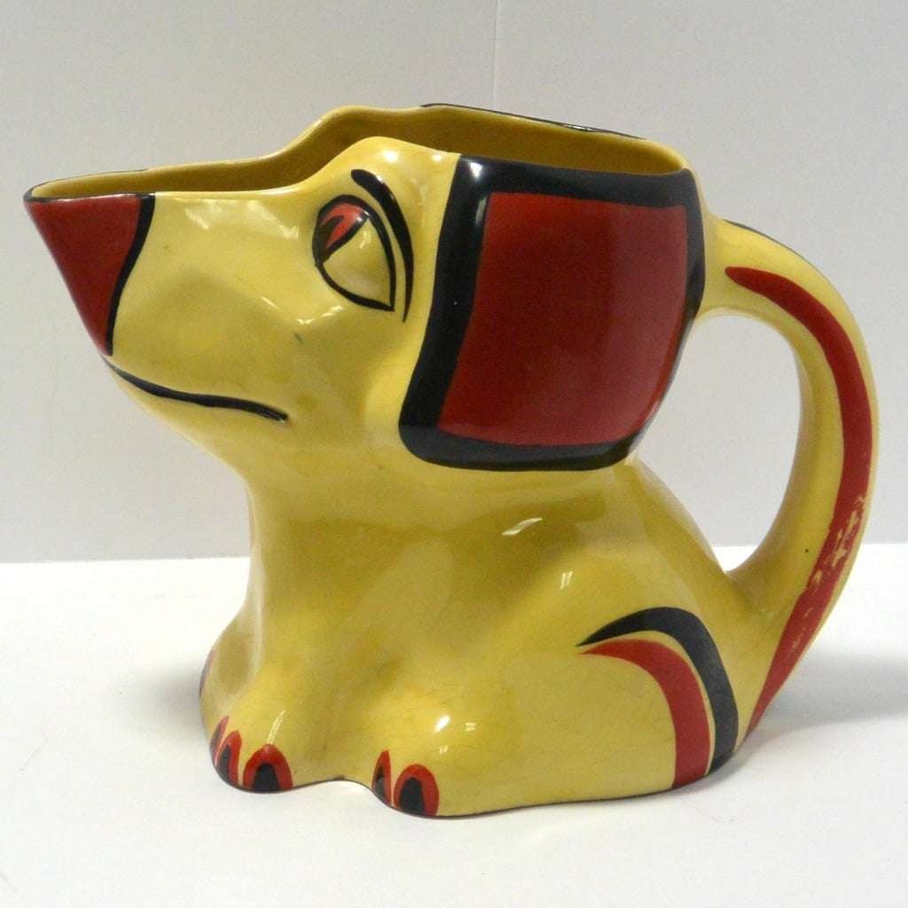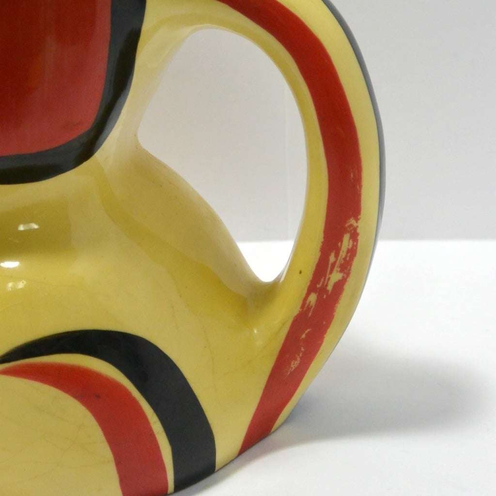 This Ditmar Urbach dog pitcher, hand-painted in red, black with a touch of white, on a yellow background is not only stunning, it is quite rare. Dating from the 1930’s, it is stamped “Handpainted Erphila Czechoslovakia” and impressed “922”. Other similar pitchers were designed and manufactured in Europe around the same time by Ditmar Urbach, but they are more commonly the rooster and the toucan. The dog is not as often found. This spectacular pitcher is in excellent condition with the exception of some slight paint loss along one side of the handle, which is extraordinary for its age. The “spots” you see along the back of the picture are not flaws, but rather reflections caused by the camera.