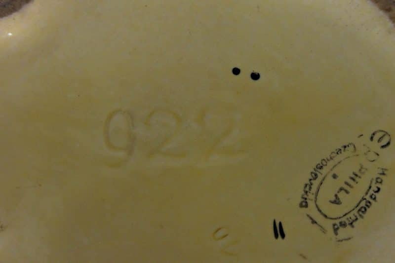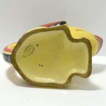 We love it as a design piece because it catches and holds your attention immediately as you walk into the room. Its whimsical design and unusual colors make it so appealing, that it’s no wonder that there are few, if any to be found for sale. It is a substantial piece, standing 6″ tall, 4″ wide and 9″ long. It weighs 1lb. 10 ounces.