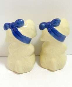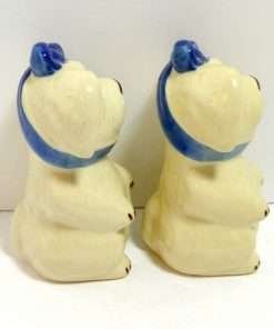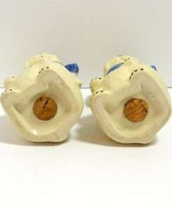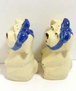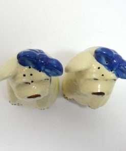 Here we have the ever-popular “Mugsy, The Toothache Dog”, large salt & pepper shakers. Standing a full 5″ tall x 3″ long x 2 1/2″ wide, this pair is in excellent condition with their original corks. Manufactured by The Shawnee Pottery Company of Zanesville, Ohio, they have their signature, cobalt blue, ribbon bandage, wrapped under their chins and tied in a bow on top of their heads. This whimsical pair can’t help but make you smile! Made in the USA, they are highly collectible and so much fun to own.
