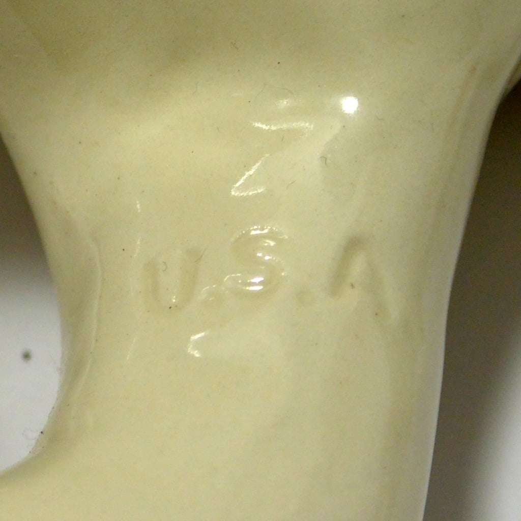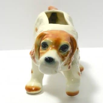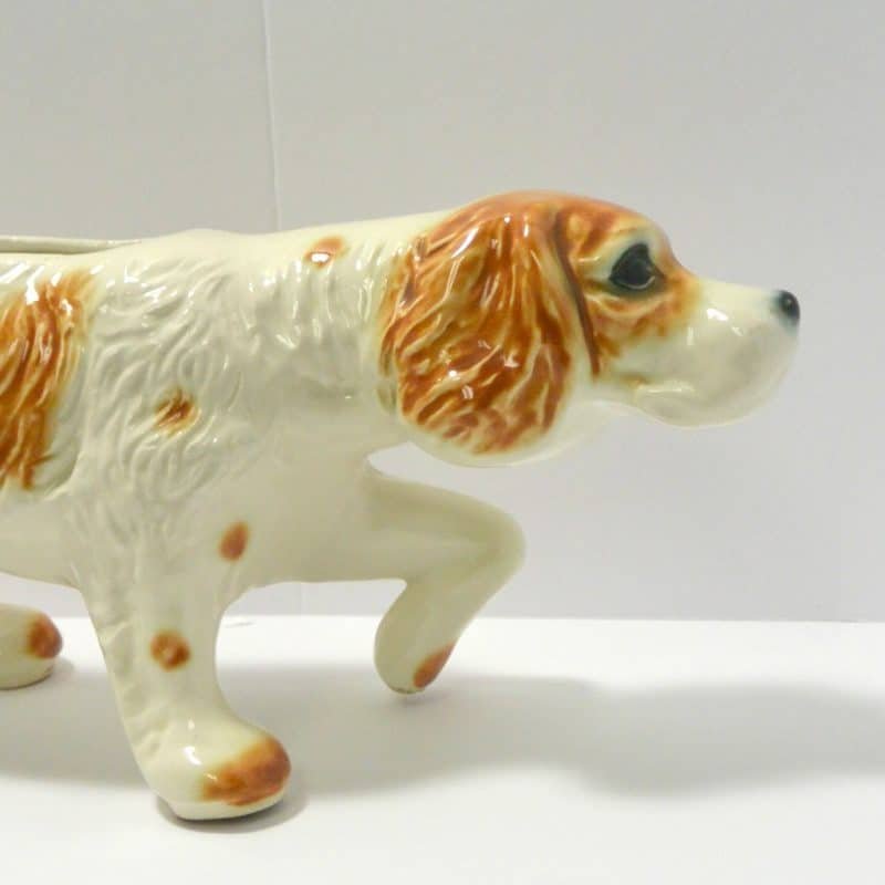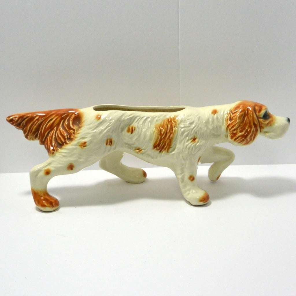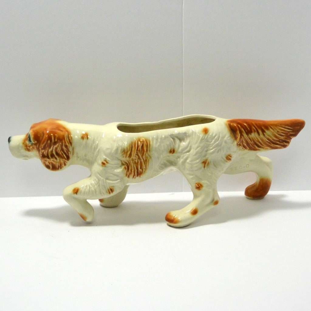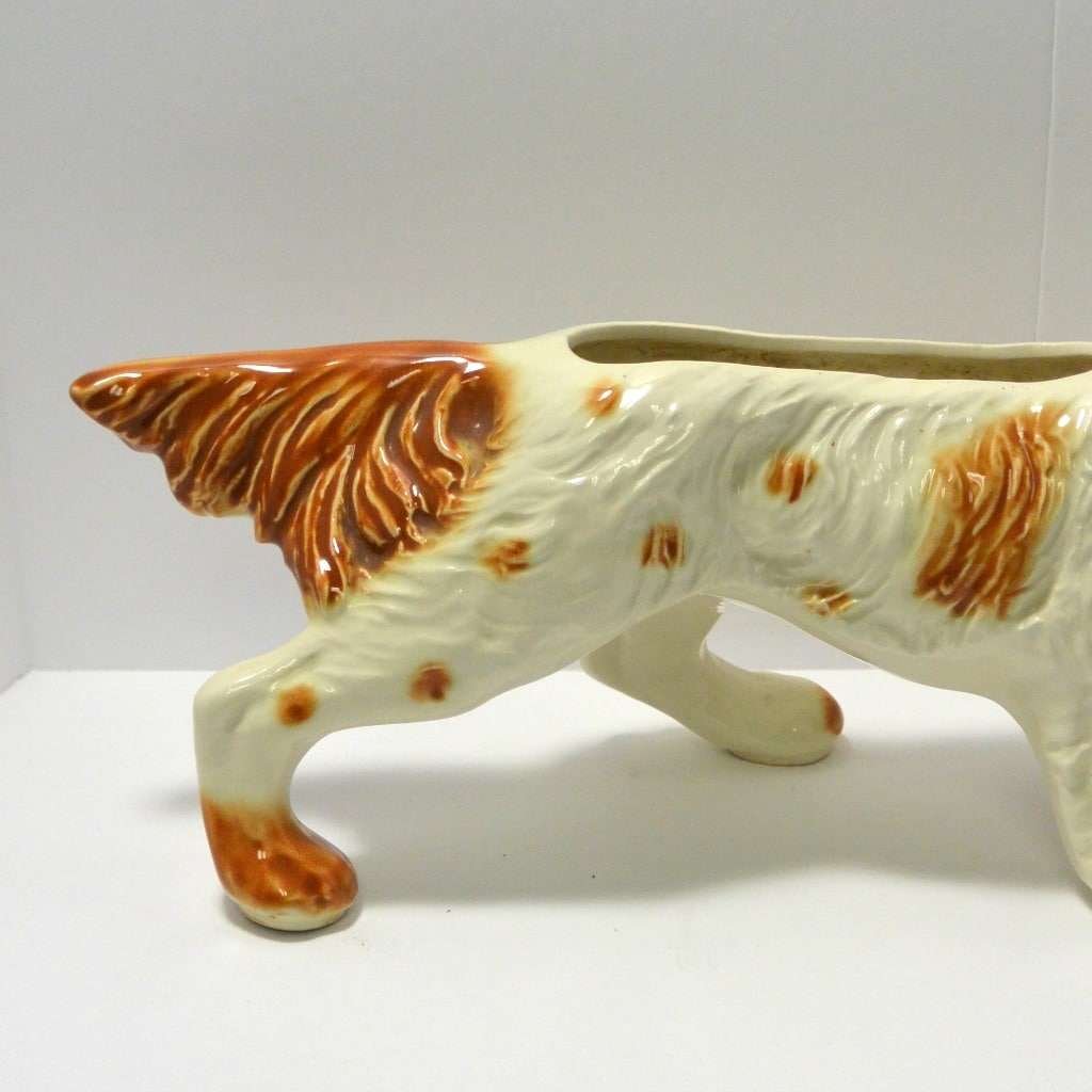 This large, vintage planter is in excellent condition. Measuring a full 16″ long x 5 1/4″ tall x 5 3/4″ wide, it is a hunting dog poised with it’s tail extended, nose to the ground, and one paw up. It has a beautiful bright caramel and white coloring with lots of fur lines and wonderful dark, deep set eyes. It is well-marked with the incised model # 280-D, and USA on the inside of one leg.