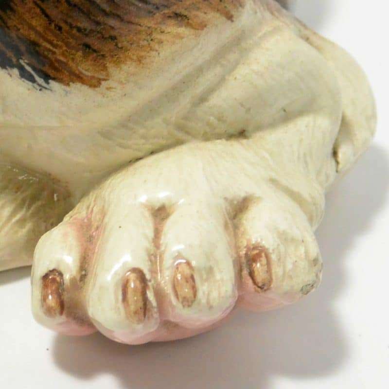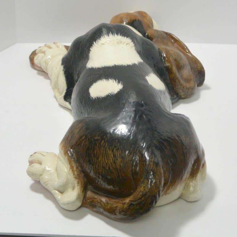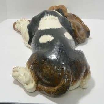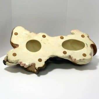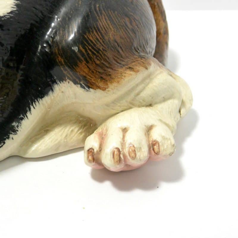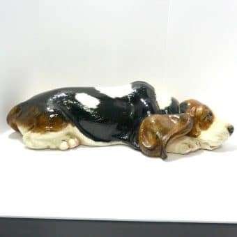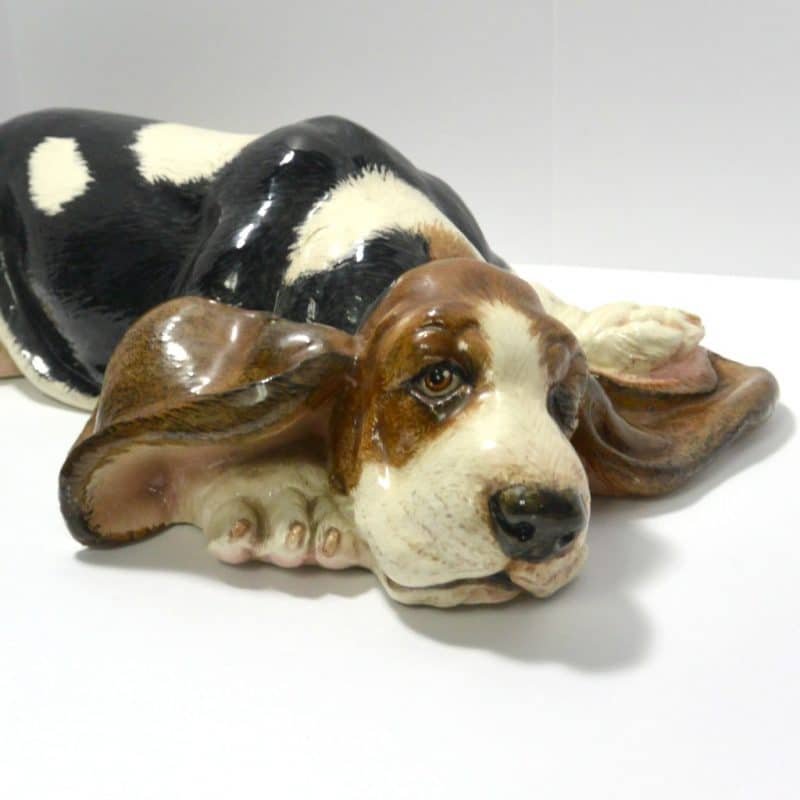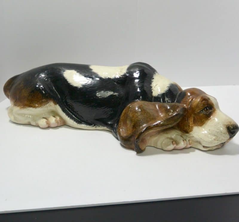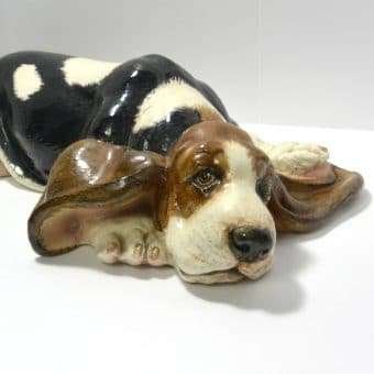 This wonderful, hand-painted, ceramic Basset Hound figurine combines the whimsical with the realistic just perfectly. Measuring a full 19″ long x 6″ tall x 11 1/2″ wide, he is in excellent condition. The detailing on this pup is extraordinary. His eyes are so perfectly done, it looks as though he catches your gaze, each time you look his way. Combine that with his puddles of ears and jowls, and the realism of his chubby paws, and you have a dog that is as close to a real Basset Hound as you can get.
