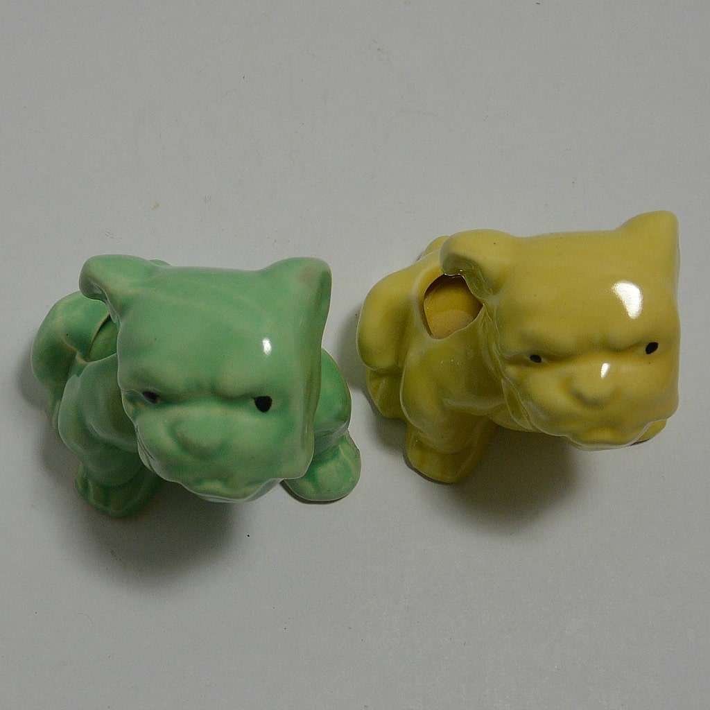They were produced by the Morton Pottery Company of Illinois between the 1930’s – 1940’s. One is done in a wonderful, lemon yellow, and the other in a soft mint green. They are in pristine condition both inside and out, with the exception of a chip along the outer edge of the front paw of the green dog (see picture.) Because of the location of this chip, they still display beautifully.