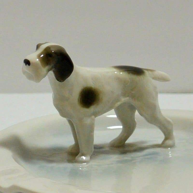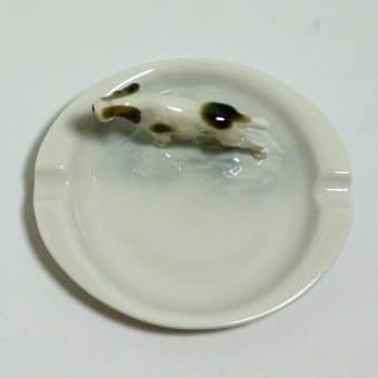 This beautiful porcelain ashtray just begs to be used as a trinket dish. It was designed and made by Metzler & Ortloff of Germany, and it carries all the charm this designer typically adds to all their canine figurines. In this case, the dog is a Fox Terrier, who is standing in the bowl of the ashtray. The entire piece is done in a creamy, white porcelain. The dog, however, looks to be standing in a puddle of water, which the artist created by adding a touch of pale blue, and a few ripples in the porcelain. It is a wonderful, whimsical, touch that really makes this piece special.