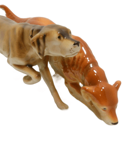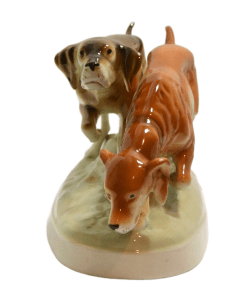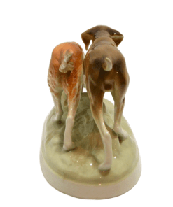Royal Dux has been making fine porcelain for over 150 years. They began making this wonderful piece in 1947. It is quite large, standing 7″ tall x 14″ long x 6 1/2″ wide, including the oval plinth that the dogs are standing on.