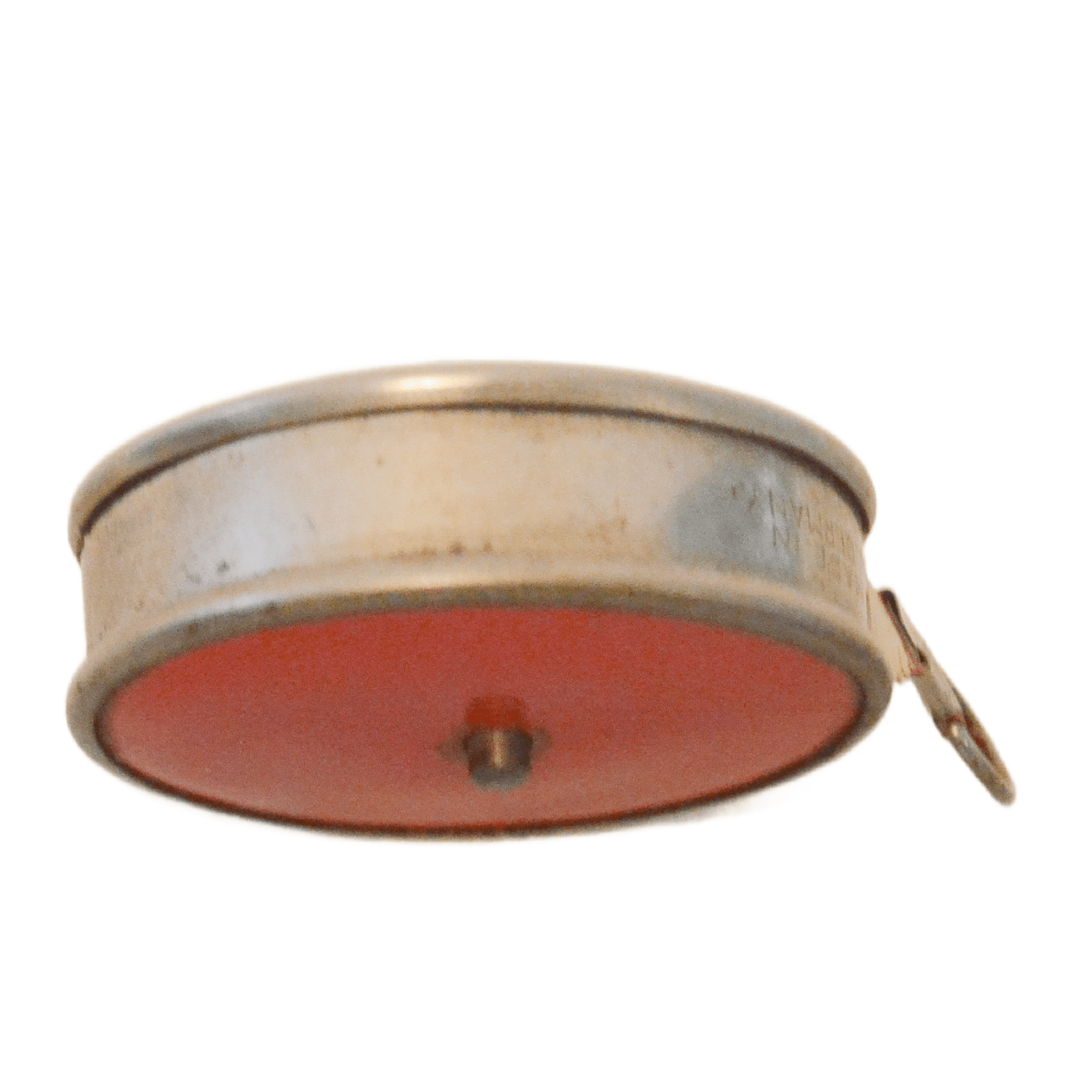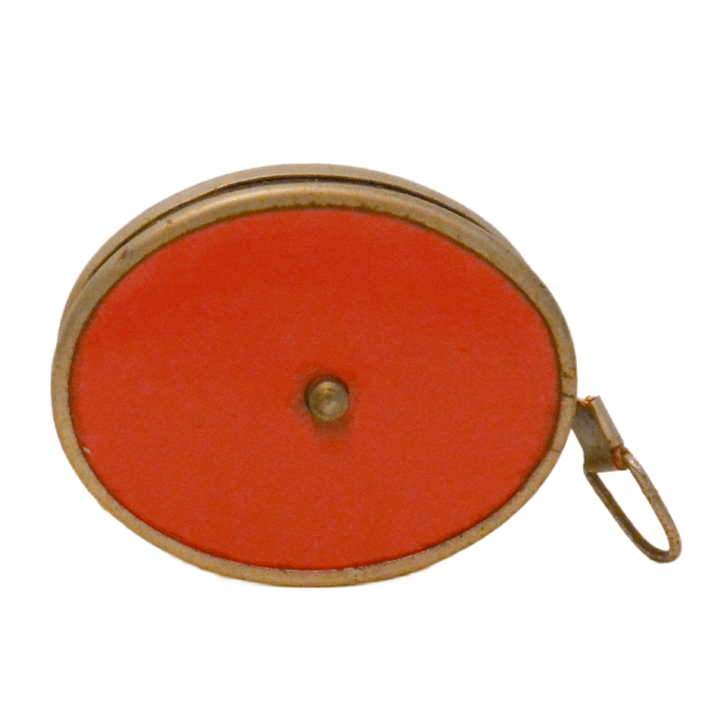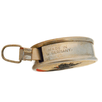 The measuring tape is a bright yellow on one side and red on the opposite side. “West Germany” is stamped on the tape, and “Made in W. Germany is stamped in the metal on the side.