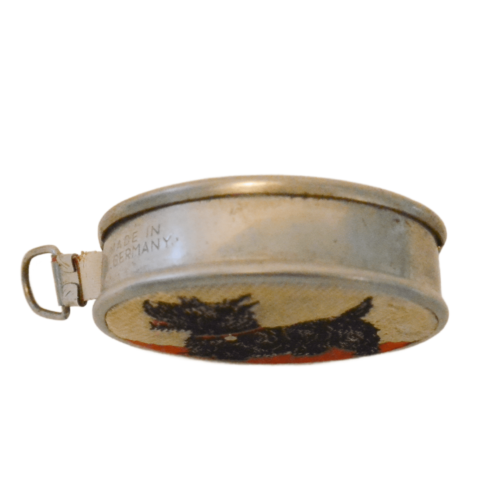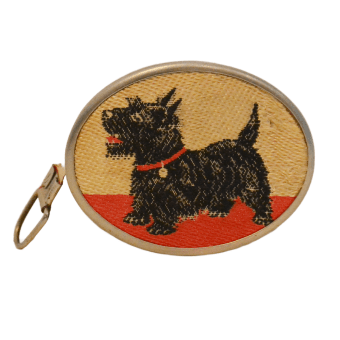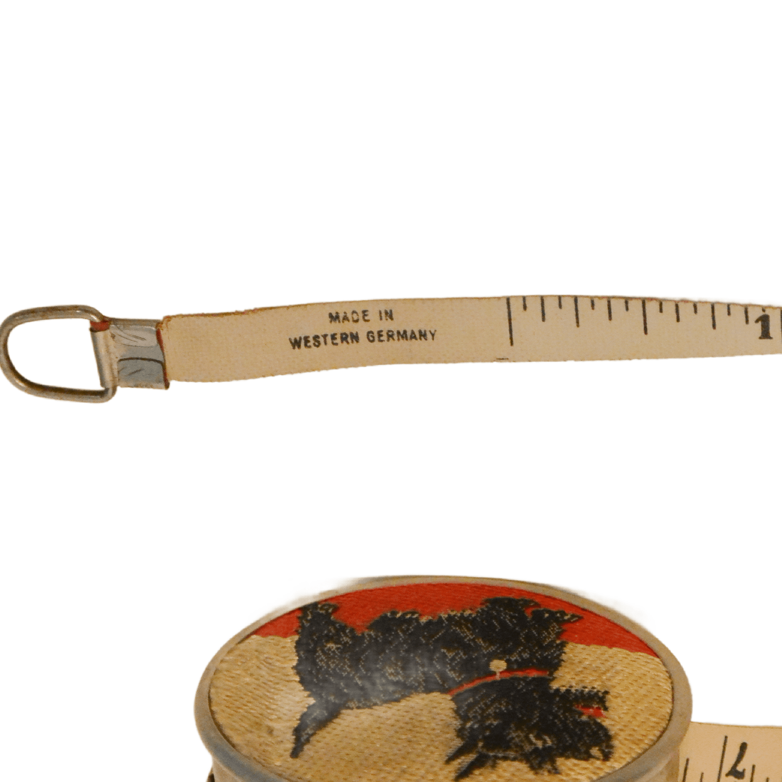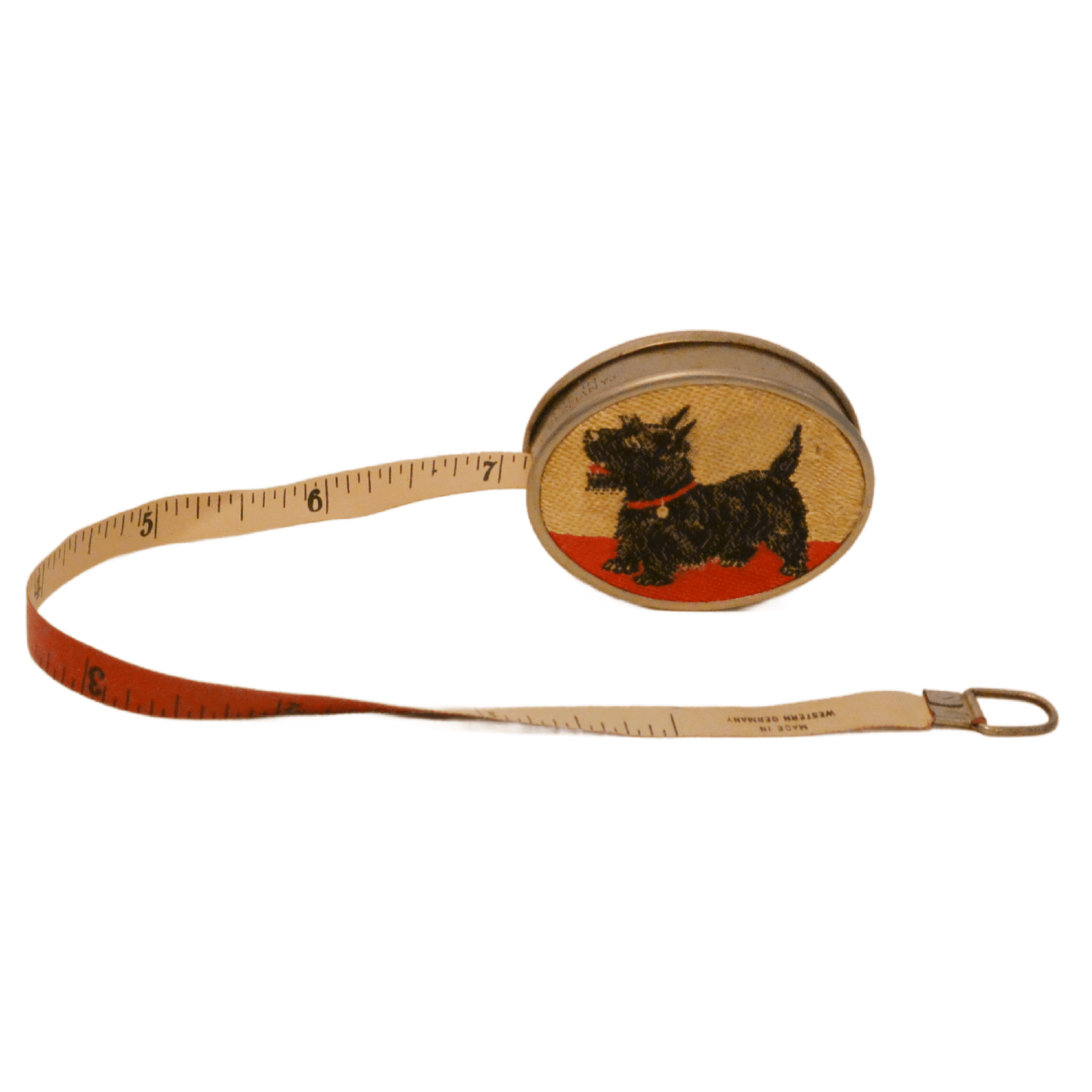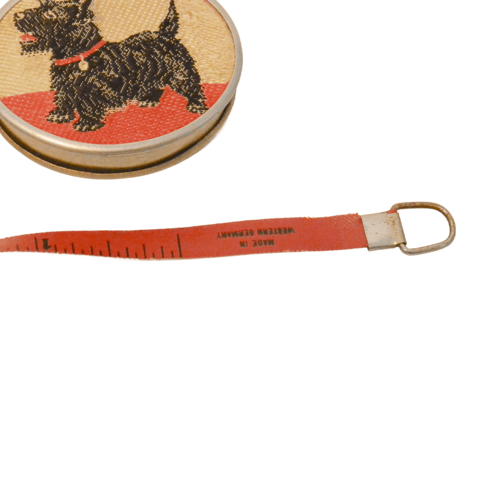 This vintage, nickel-plated, measuring tape has a sweet Scottish Terrier dog embroidered on the front.