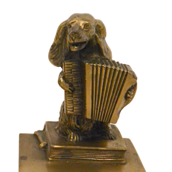 This pair of antique brass bookends feature the cutest cocker spaniel puppies, intent on playing accordions!