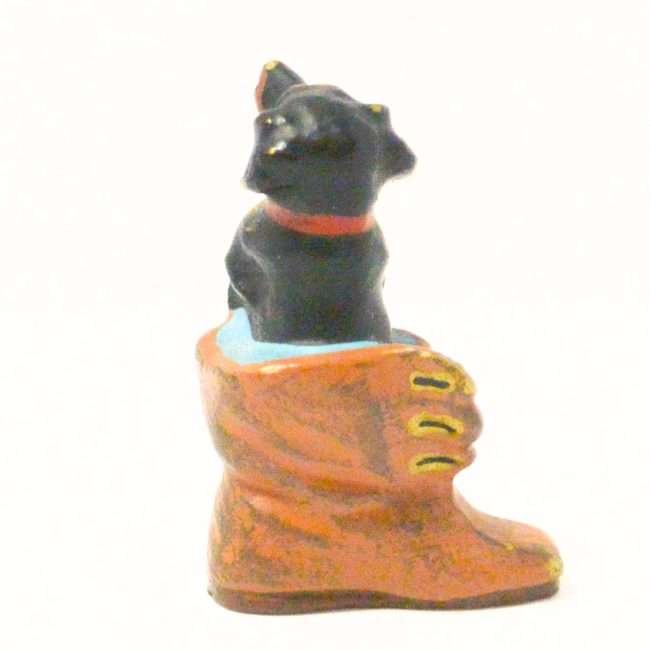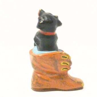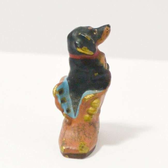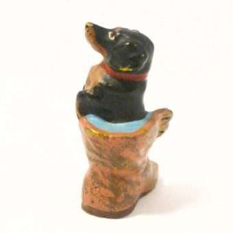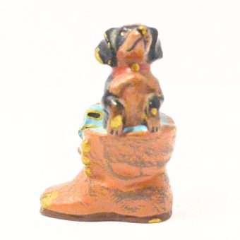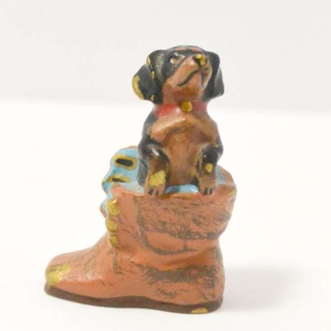 This miniature, cold painted Austrian bronze Dachshund seems quite comfortable in a well-worn boot.