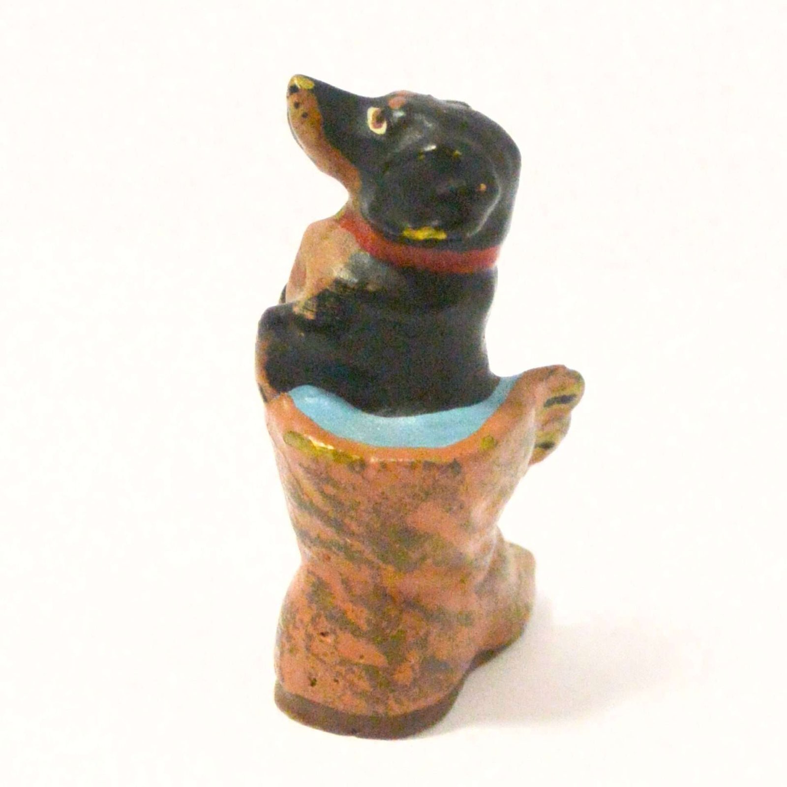This black and tan Dachshund has a bright red collar with a tiny gold-painted tag. The boot is also highly-detailed with a light blue lining, and gold buttons.