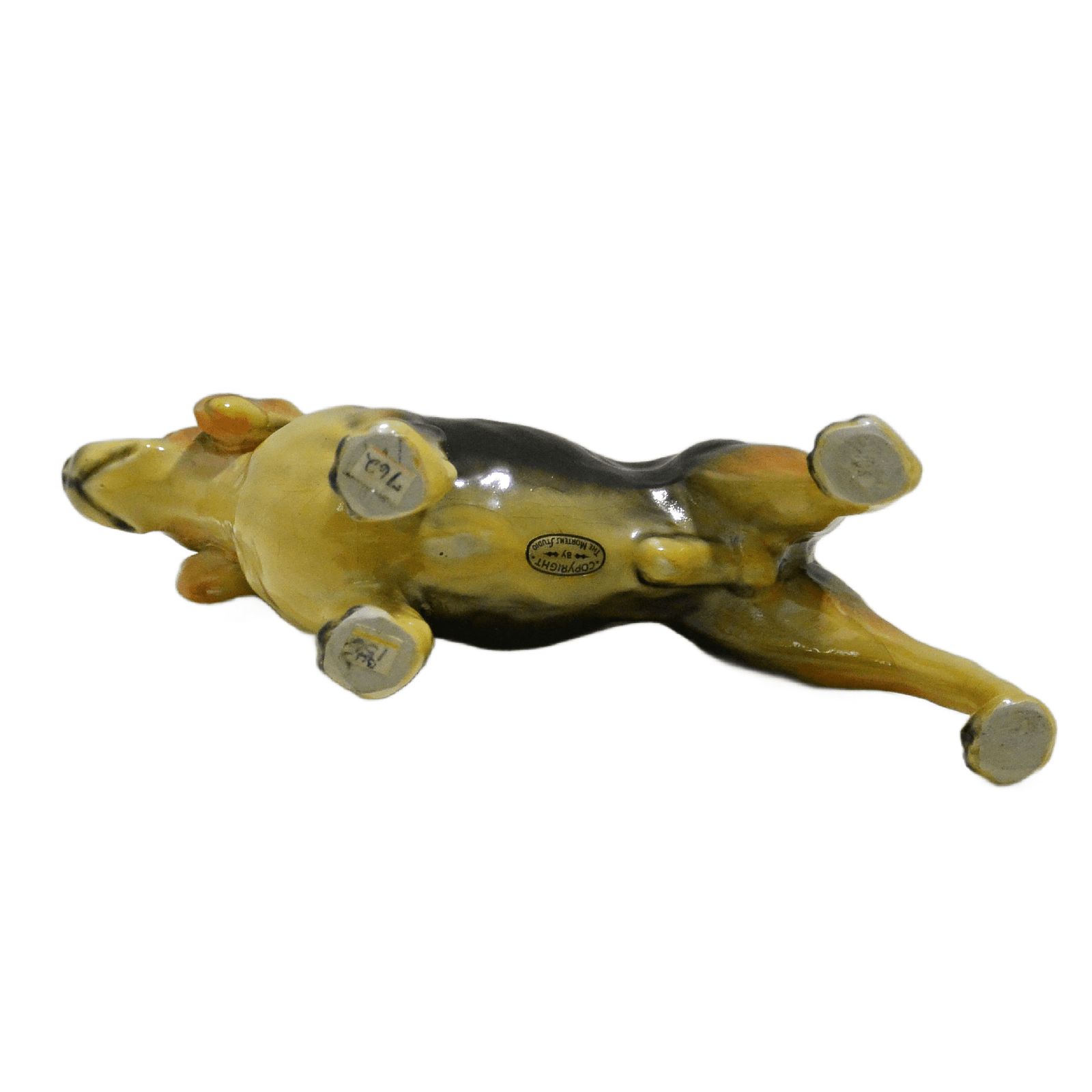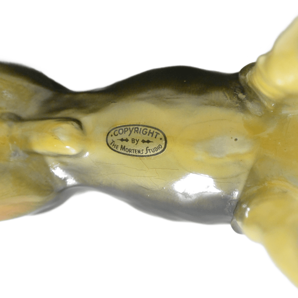 The designer of this figurine, Oscar Morten, immigrated from Sweden to the U.S. and opened a giftware studio in Chicago in 1931. Over the next two decades, he created over 300 popular dog and horse models. Composed of ceramic over a metal skeleton, these figurines, although beautiful and engaging, were prone to crazing and flaking, thus making it difficult, today, to find examples in perfect condition.