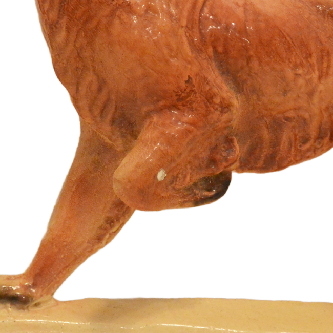 This fabulous piece is in excellent, ready-to-hang condition. It has a very tiny chip on his raised leg, and another on his muzzle. It has a small, attached metal loop on the back of the frame, where it can be used to hang it securely on the wall.