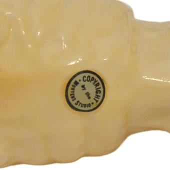 The designer of this figurine, Oscar Morten, immigrated from Sweden to the U.S. and opened a gift ware studio in Chicago in 1931. Over the next 32 years, he created over 300 popular dog and horse models. Composed of ceramic over a metal skeleton, these figurines, although beautiful and engaging, were prone to crazing and flaking, thus making it difficult, today, to find examples in perfect condition. This gorgeous Standard Poodle is one of the more difficult to find of the Morten Studio dogs, and she is in excellent condition.
