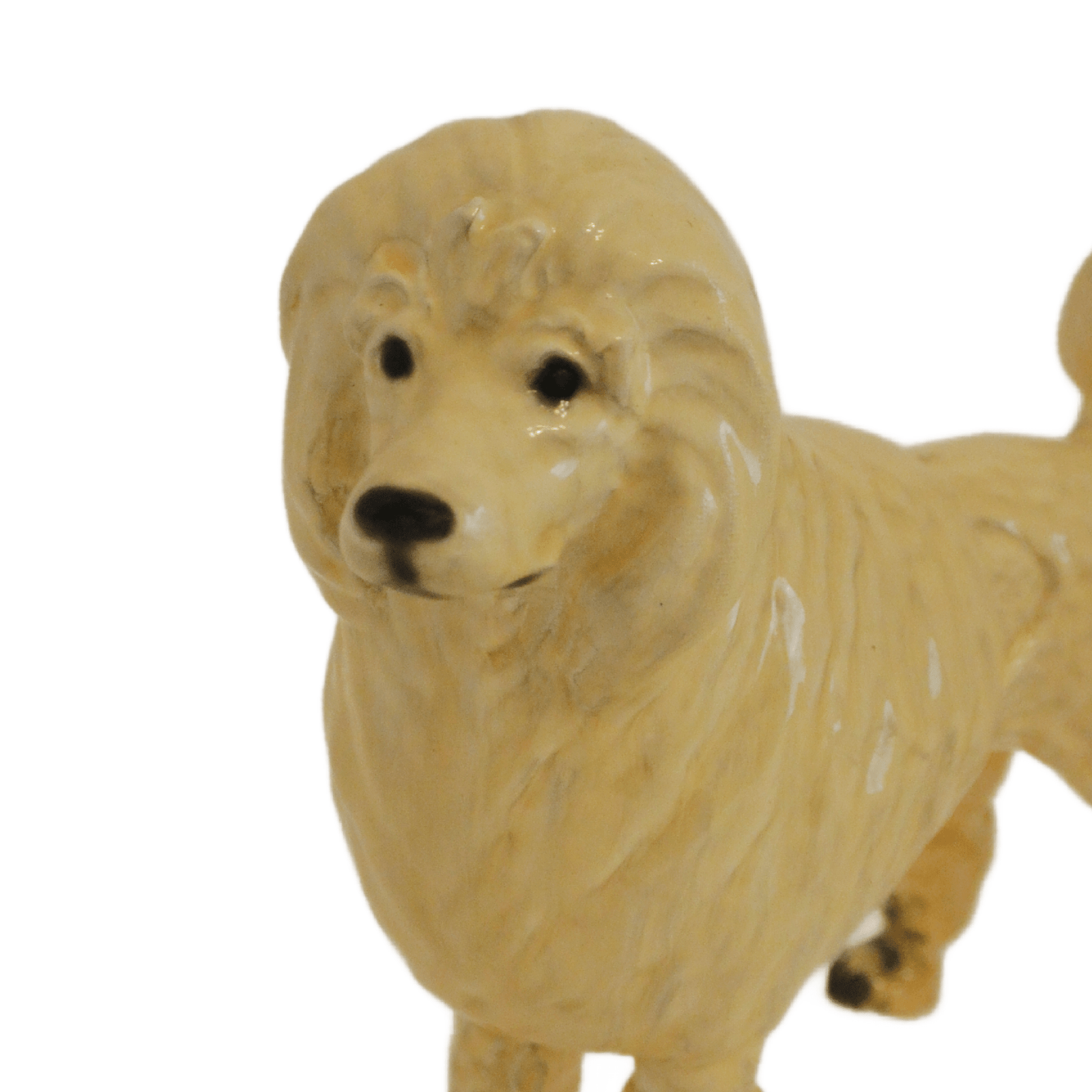 The designer of this figurine, Oscar Morten, immigrated from Sweden to the U.S. and opened a gift ware studio in Chicago in 1931. Over the next 32 years, he created over 300 popular dog and horse models. Composed of ceramic over a metal skeleton, these figurines, although beautiful and engaging, were prone to crazing and flaking, thus making it difficult, today, to find examples in perfect condition. This gorgeous Standard Poodle is one of the more difficult to find of the Morten Studio dogs, and she is in excellent condition.