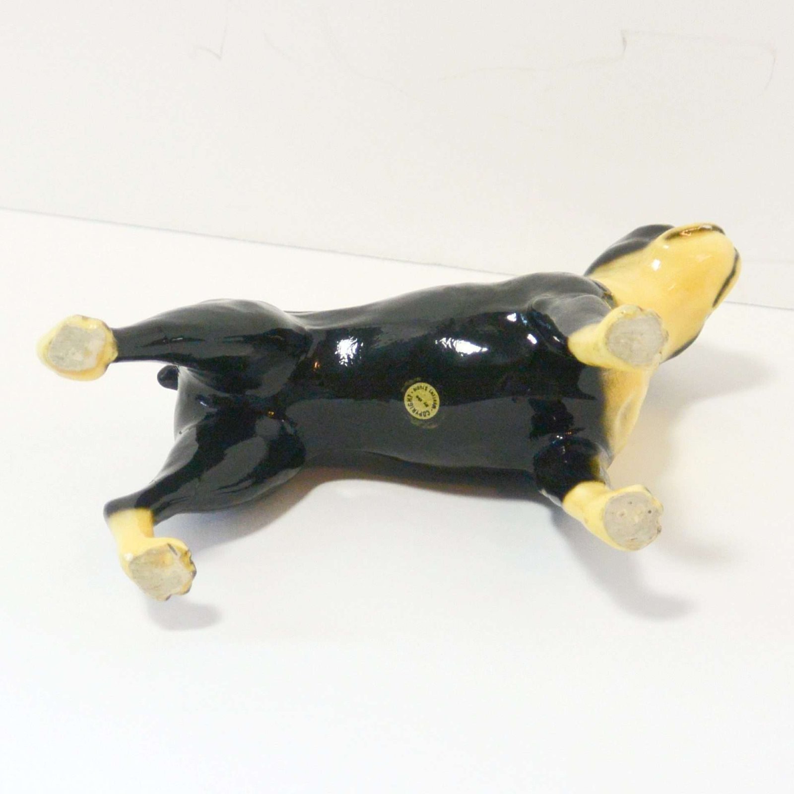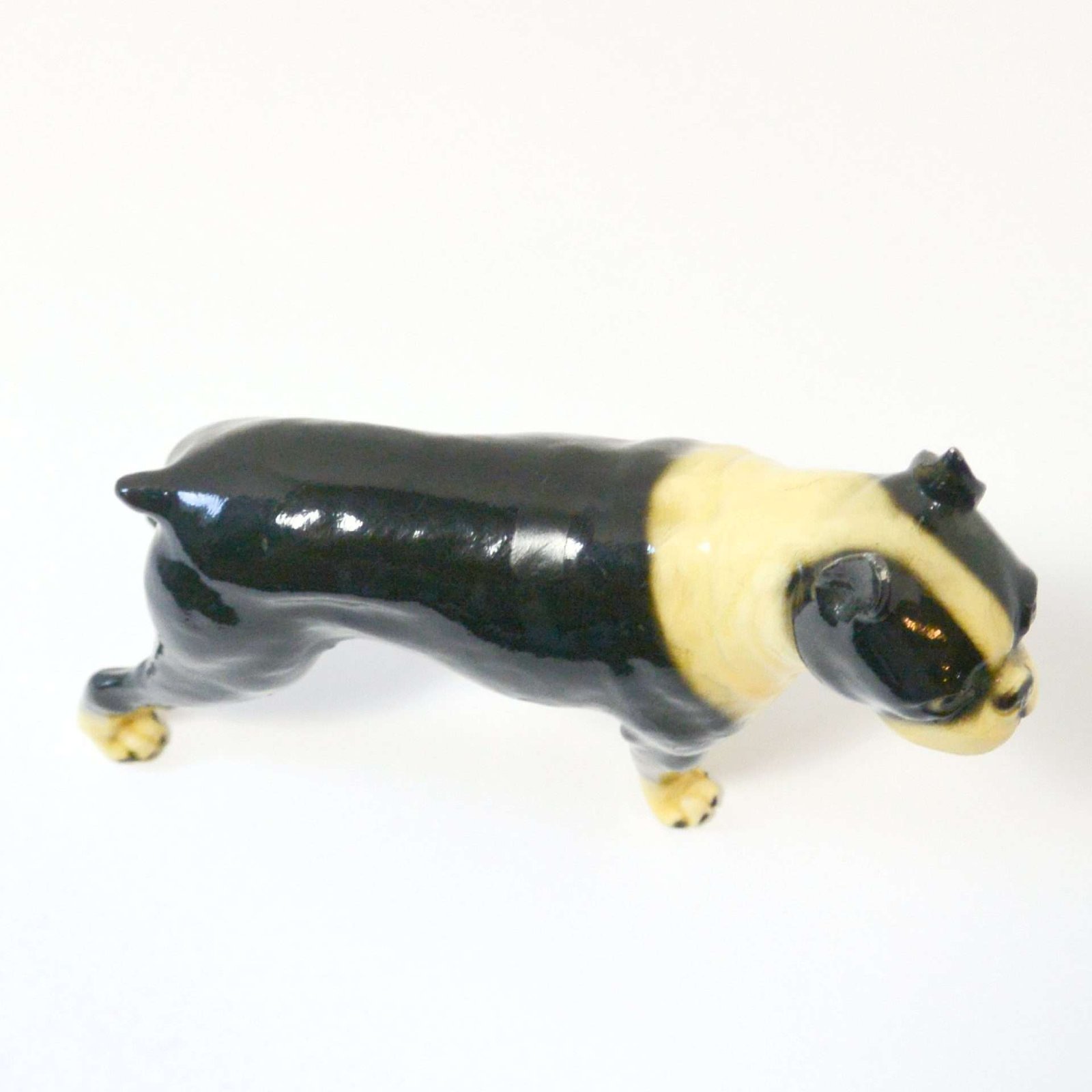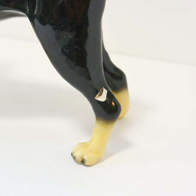 Measuring a full 5 1/2″ tall x 7″ long x 2 1/4″ wide, he has a chip on the back of one leg, and a rough spot at the top of one ear. Otherwise, he is in excellent, ready-to-display condition.