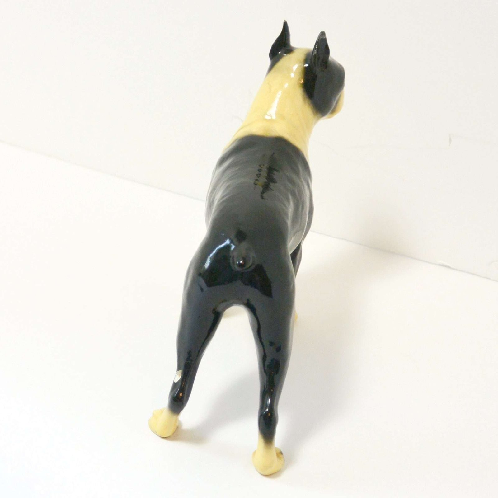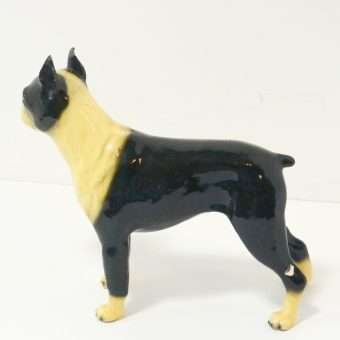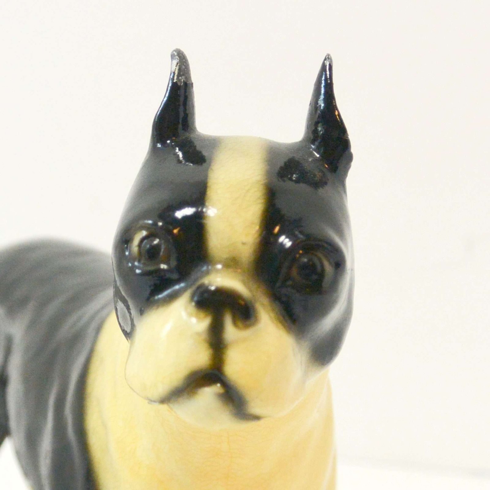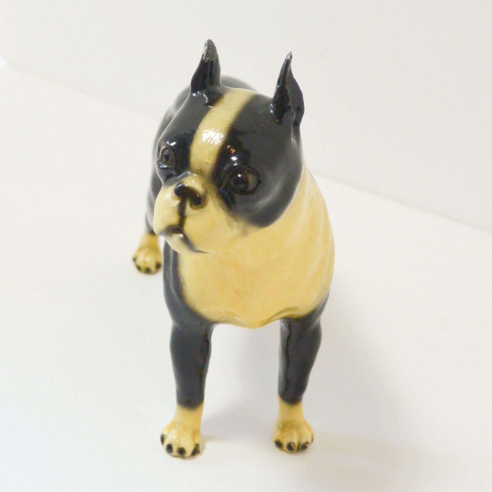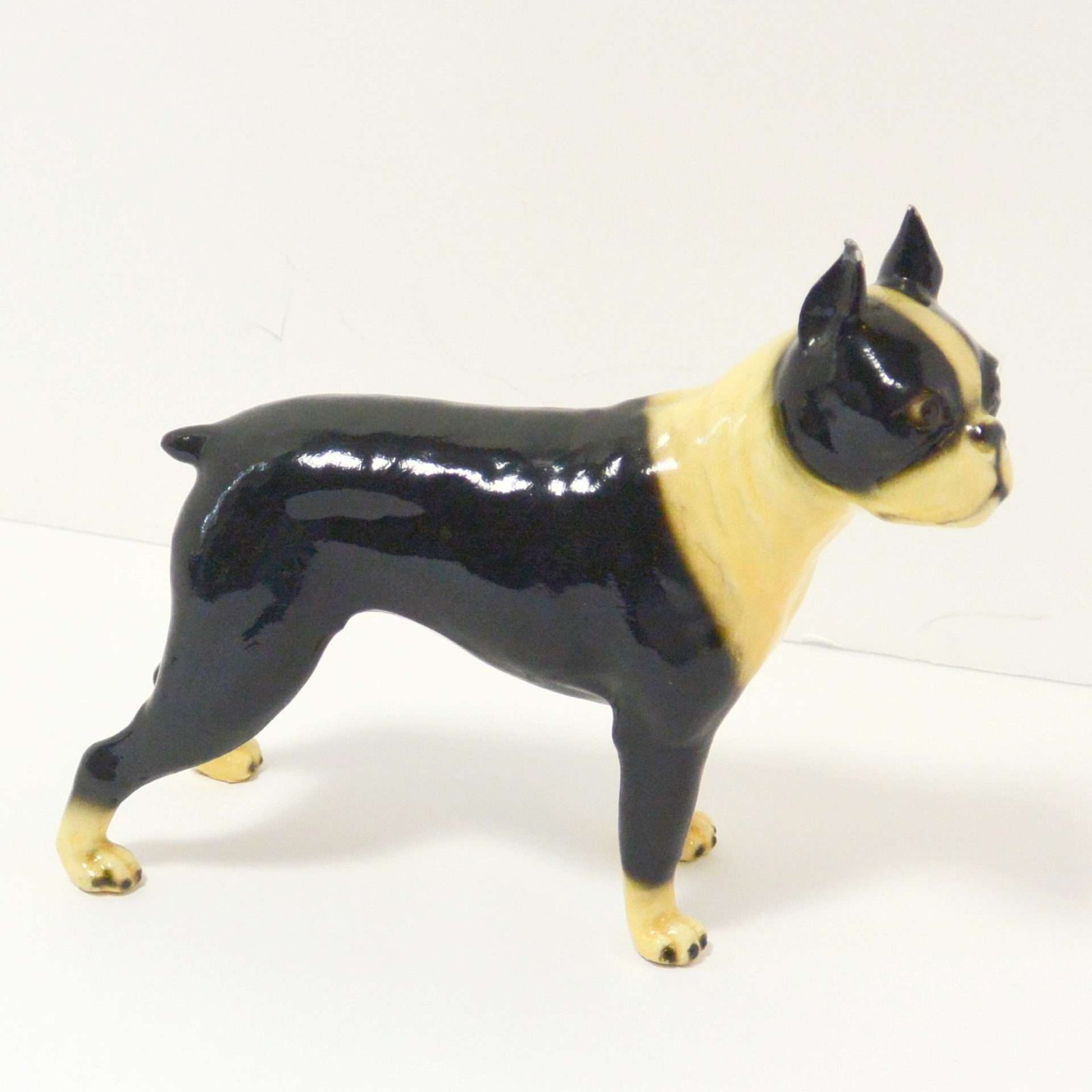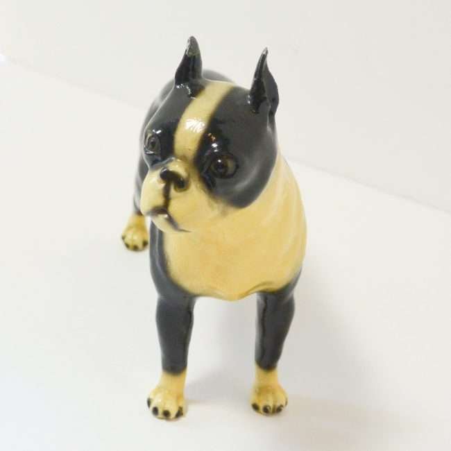 This wonderful, standing Boston Terrier figurine looks alert and ready to go after what he has fixed his gaze on.