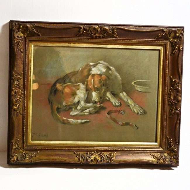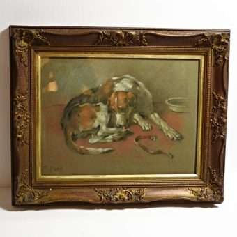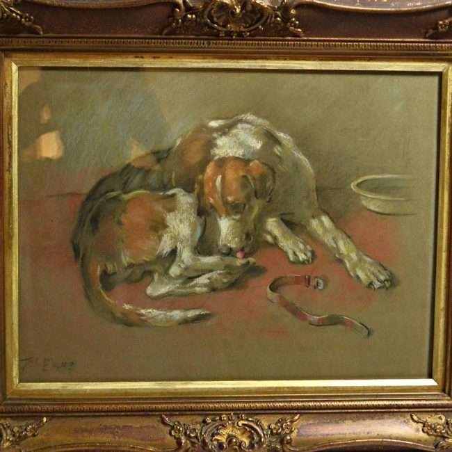 This original painting pastel by the well-known artist, John Emms, is a sensitive and beautiful depiction of a Foxhound tenderly licking its paw.