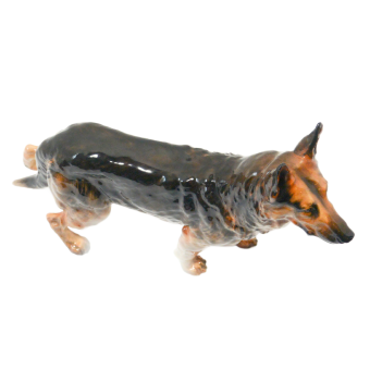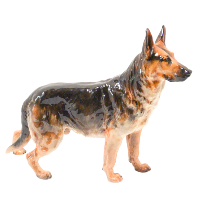 This very realistic porcelain German Shepherd dog figurine is the largest canine model done by Royal Doulton, measuring a full 7 1/2 ” tall x 9 1/2″ long x 3 1/2″ wide.