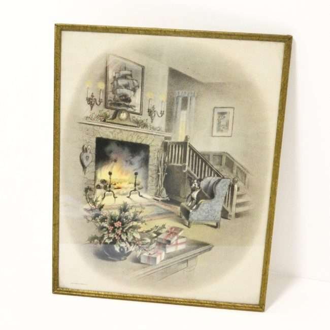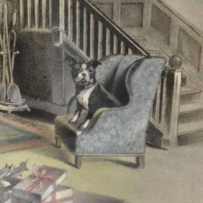 Done in the muted grays against a creamy background, it also draws your eyes to the Boston Terrier dog seated in the wingback armchair, by tinting the chair a soft light blue.