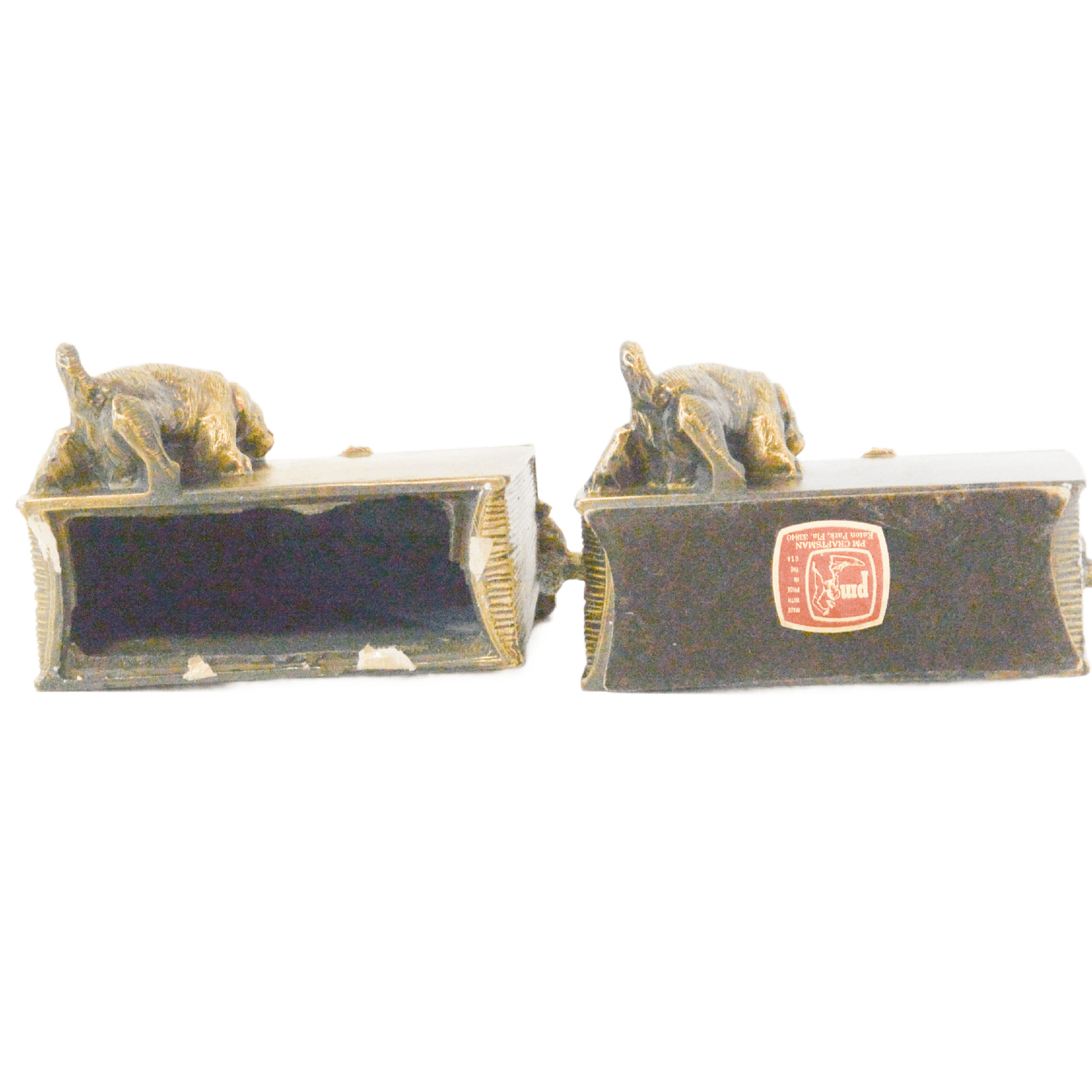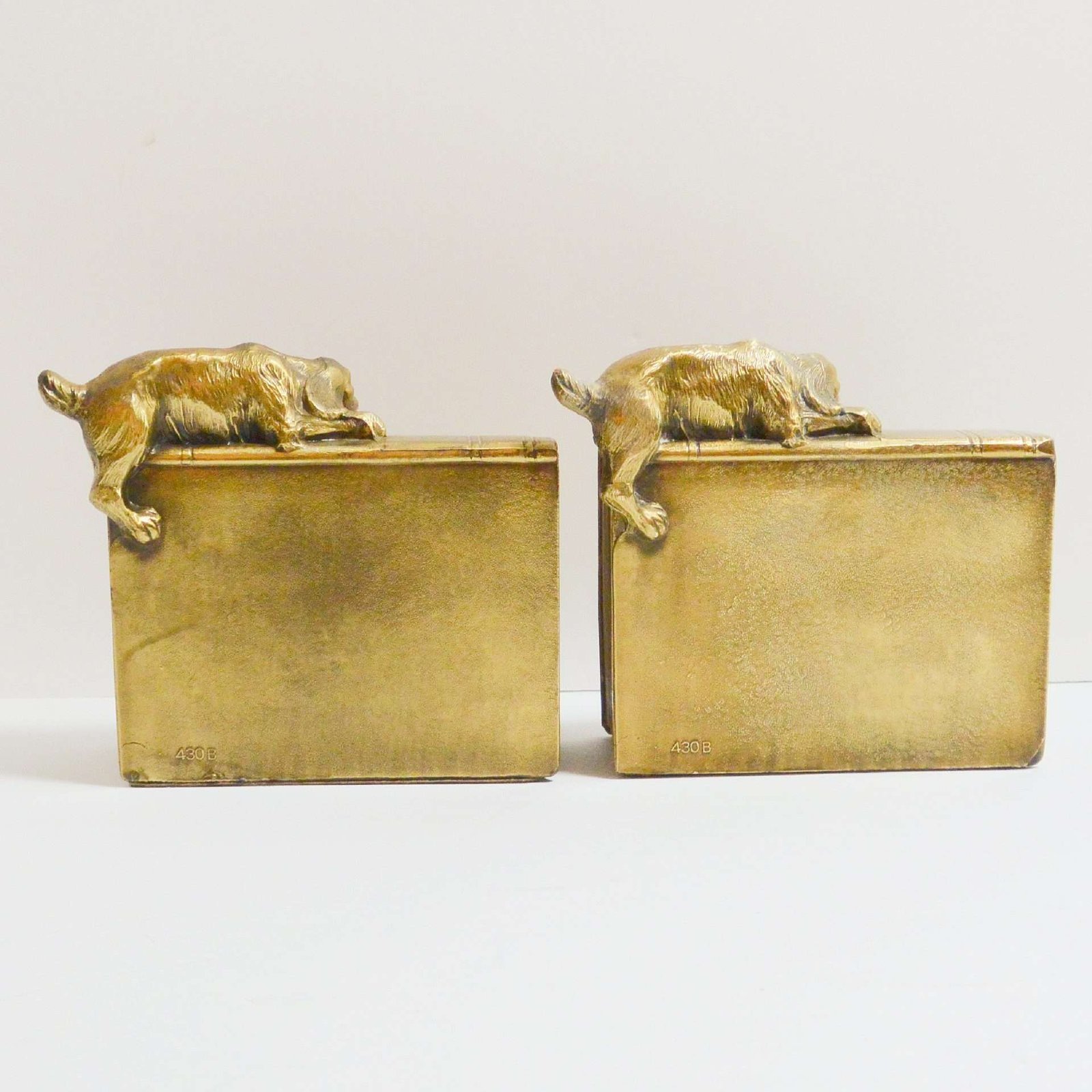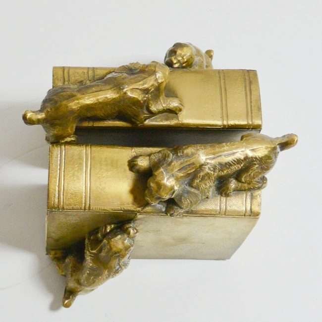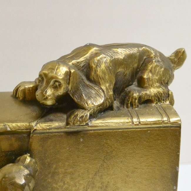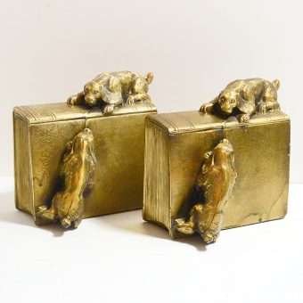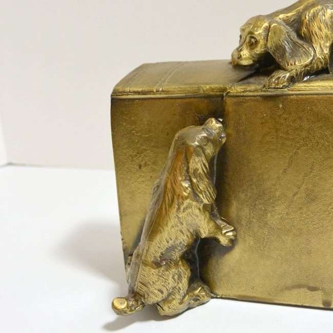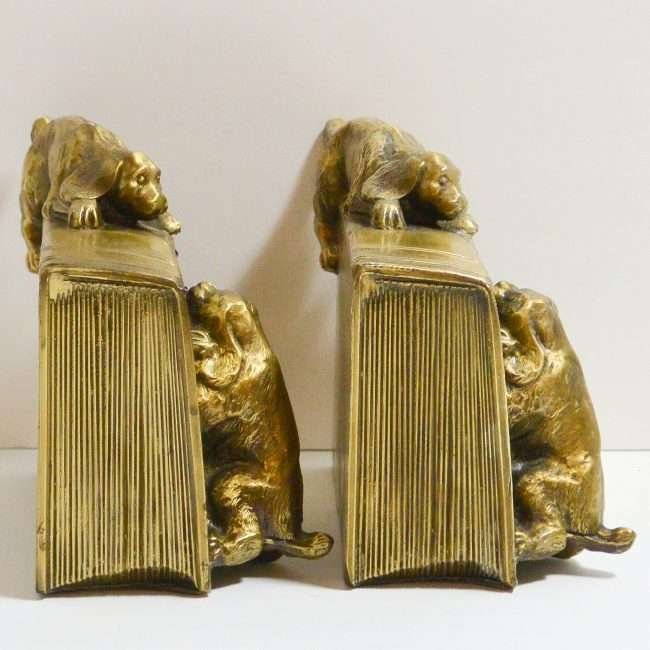 This wonderfully detailed set of dog bookends is identified in “The Collector’s Encyclopedia of Bookends” by Louis Kuritzky and Charles DeCosta, and titled “Dogs at Play.” In this book, they are given a rarity of 5, with 5 being the most rare.