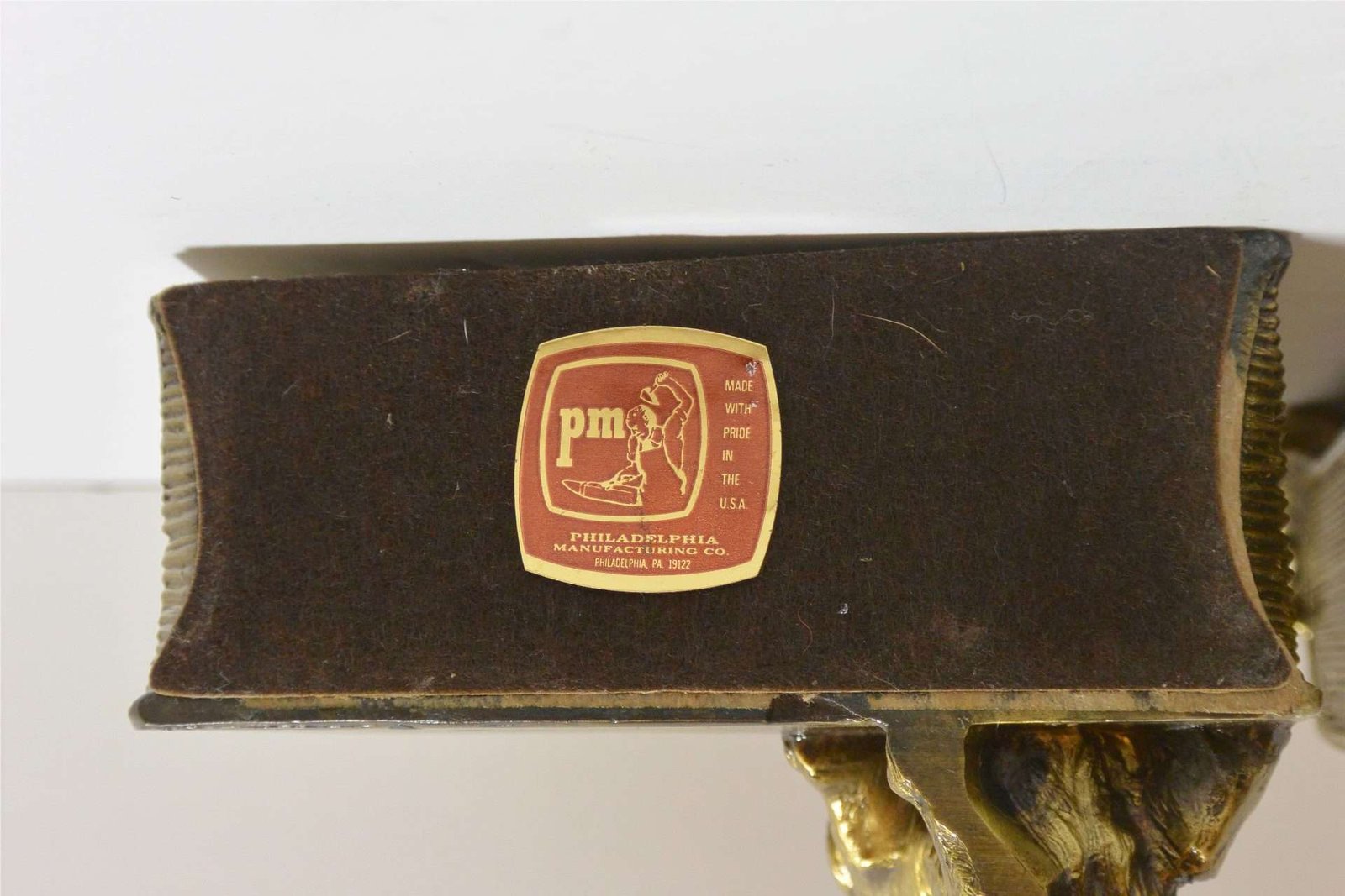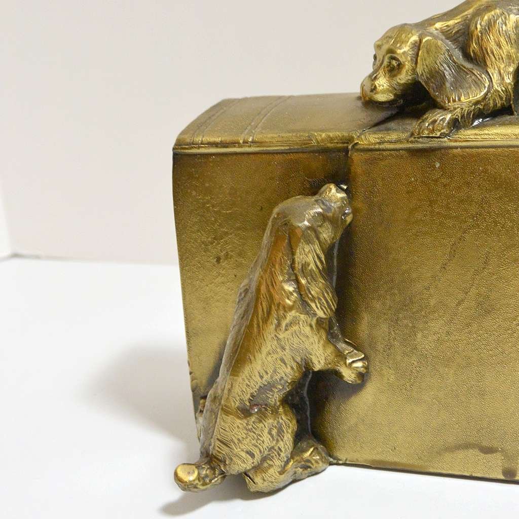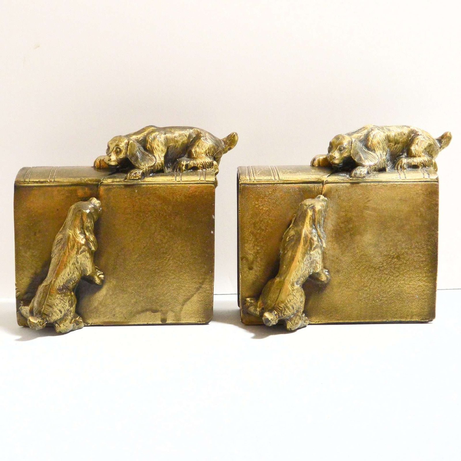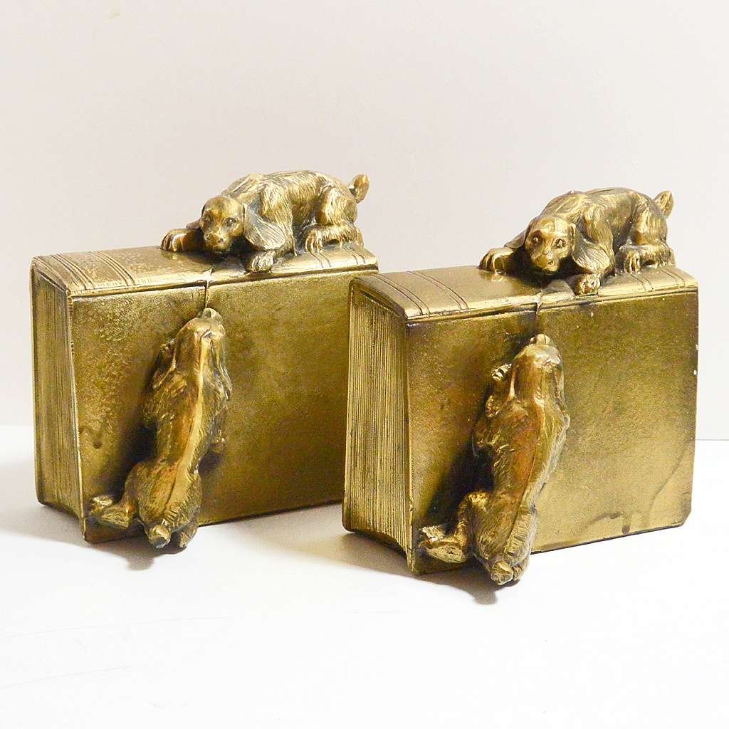 This enchanting pair of brass Cocker Spaniel dogs bookends was made in the USA by the PM Craftsman Company of Eaton Park, FL. c.1930. They depict two lively Cocker Spaniel dogs trying to reach each other, while one is lying on the spine of an overturned book and the other is attempting to scale the book from the side.