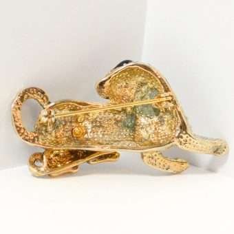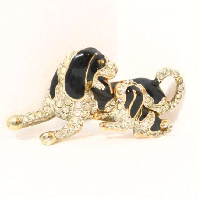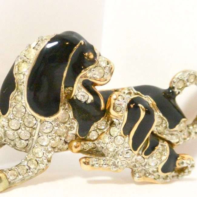 The beautiful combination of black enamel, clear rhinestones, and a gold tone trim, makes this brooch both unique and a stand-out addition to your canine brooch collection.