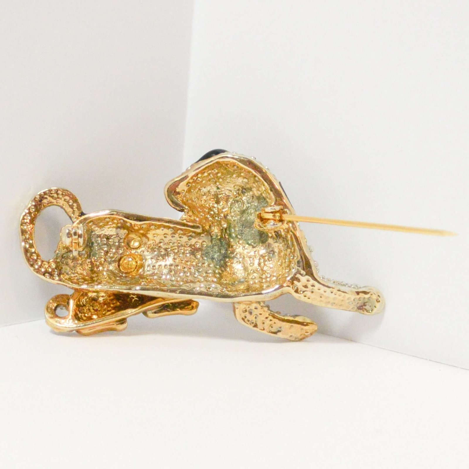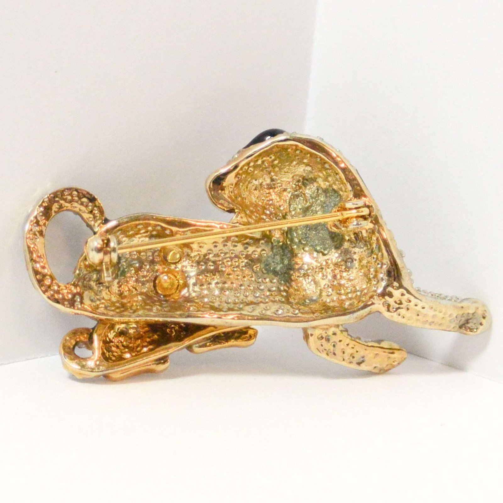 The beautiful combination of black enamel, clear rhinestones, and a gold tone trim, makes this brooch both unique and a stand-out addition to your canine brooch collection.