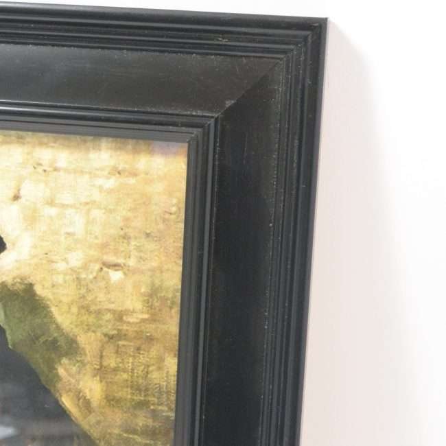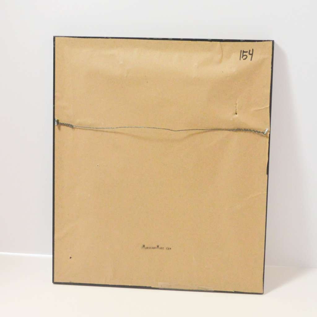 Measuring 13 1/2″ tall x 11 1/2″ wide, it is framed in a simulated wood frame under glass and it is in excellent condition.