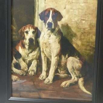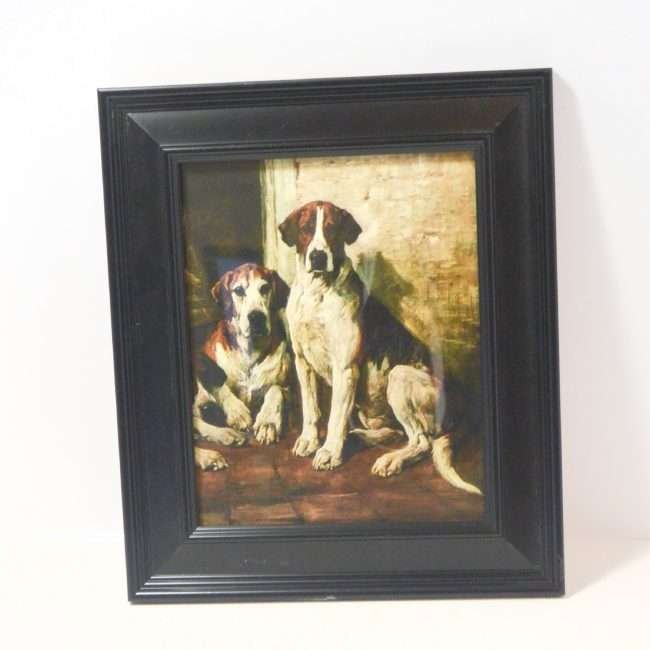 This interesting print is a cropped version of the original painting by John Emms entitled “Hours of Idleness, Hounds in a Stable.”