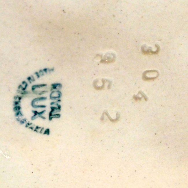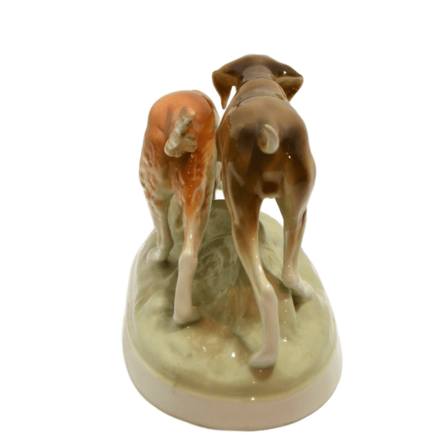 Royal Dux has been making fine porcelain for over 150 years. They began making this wonderful piece in 1947. It is quite large, standing 7″ tall x 14″ long x 6 1/2″ wide, including the oval plinth that the dogs are standing on.