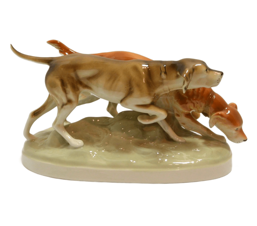 This elegant, hand-painted, porcelain figurine of a pair of Sporting Dogs was made in Czechoslovakia by Royal Dux.