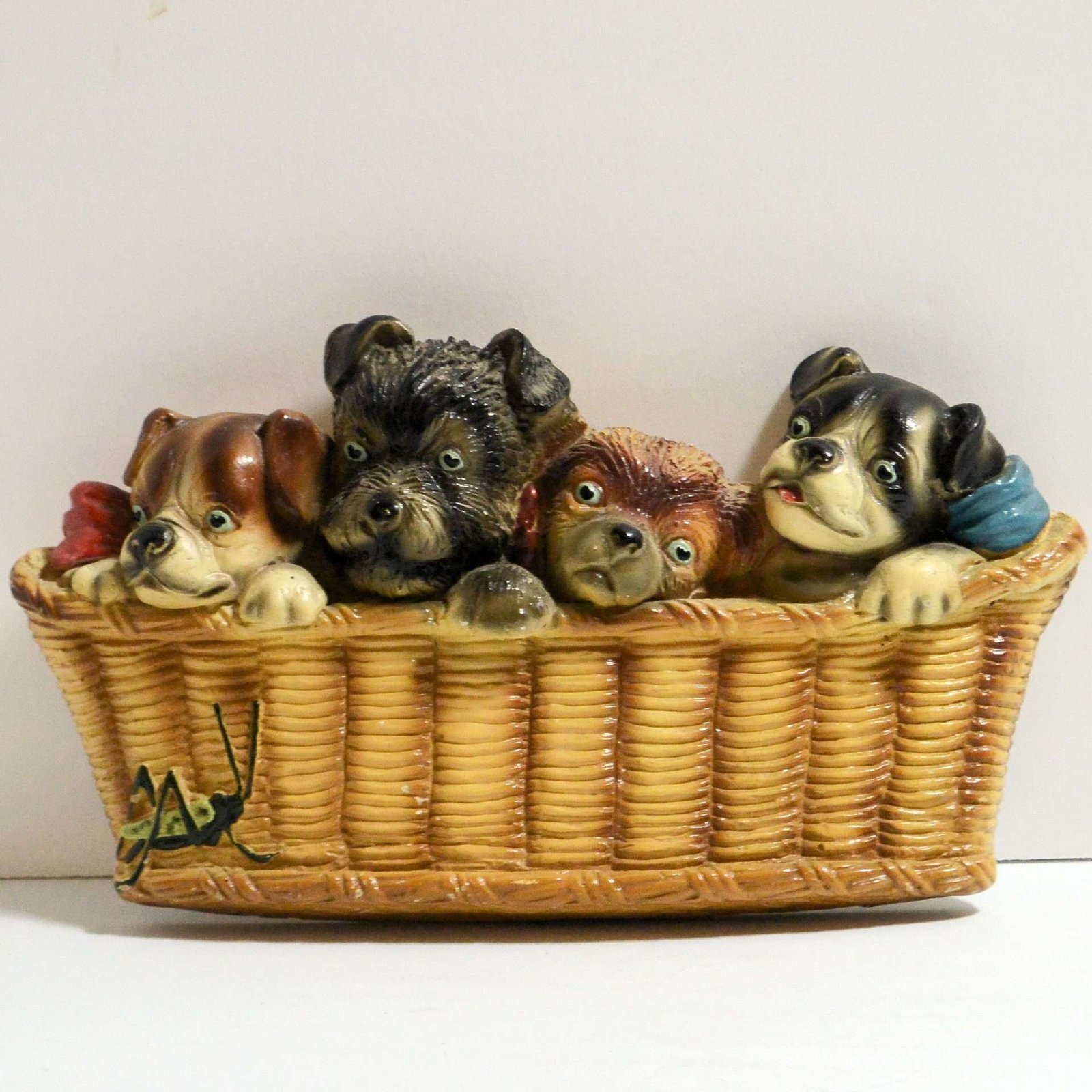 This wonderful, vintage chalkware wall plaque features four perky puppy dogs looking for fun. Whether they have actually spotted the grasshopper on the front of the basket is up to your imagination.