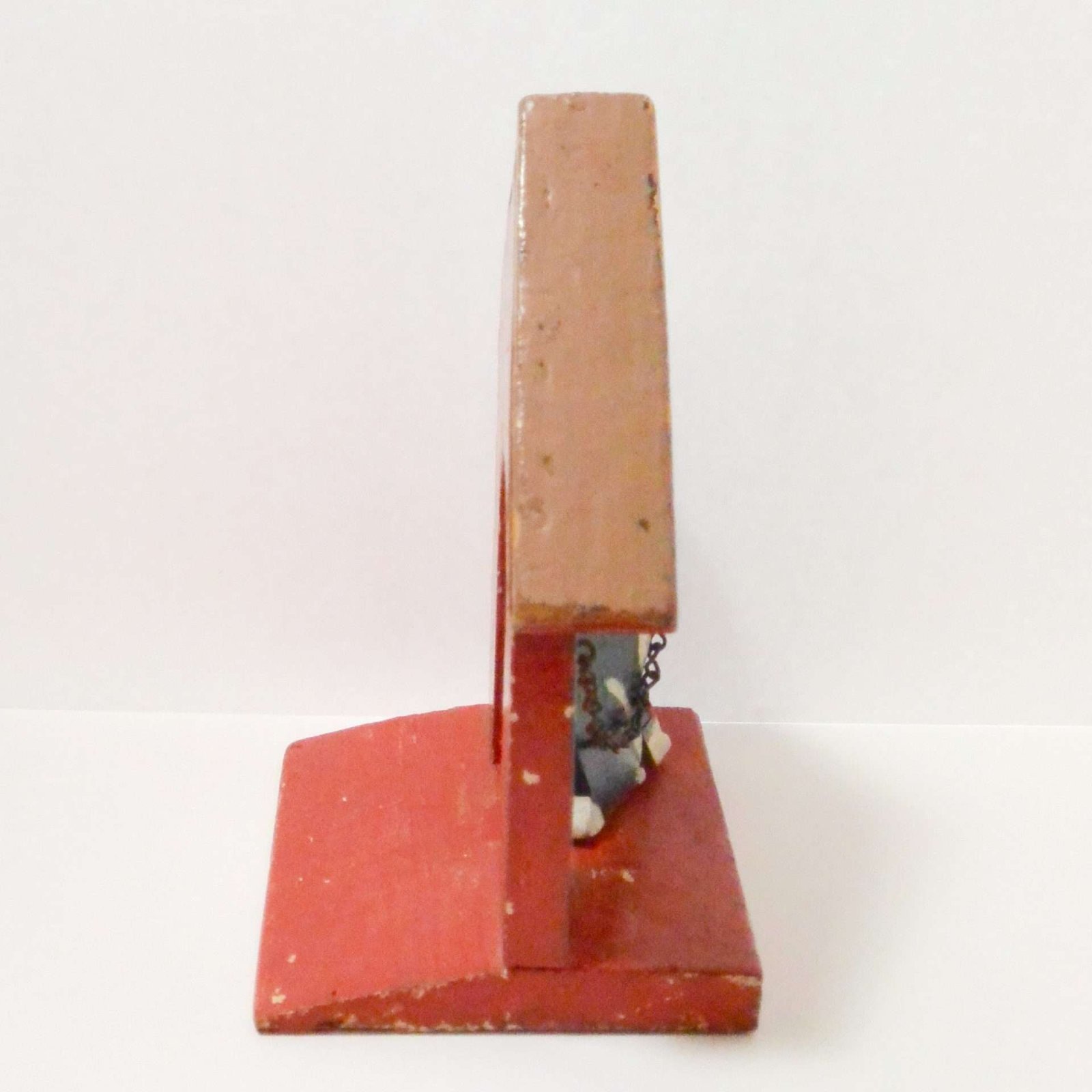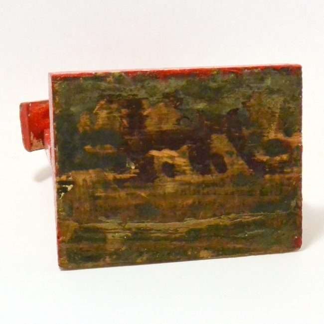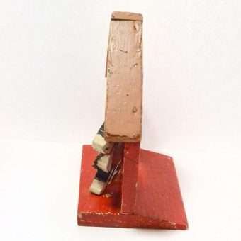 This wonderful vintage folk art dog with his doghouse was handmade and hand-painted in the 1940’s. Measuring a full 9 1/2″ tall x 7″ long x 5 1/4″ wide, it shows its age with missing original paint and worn edges. However, it still retains every bit of its vintage character.