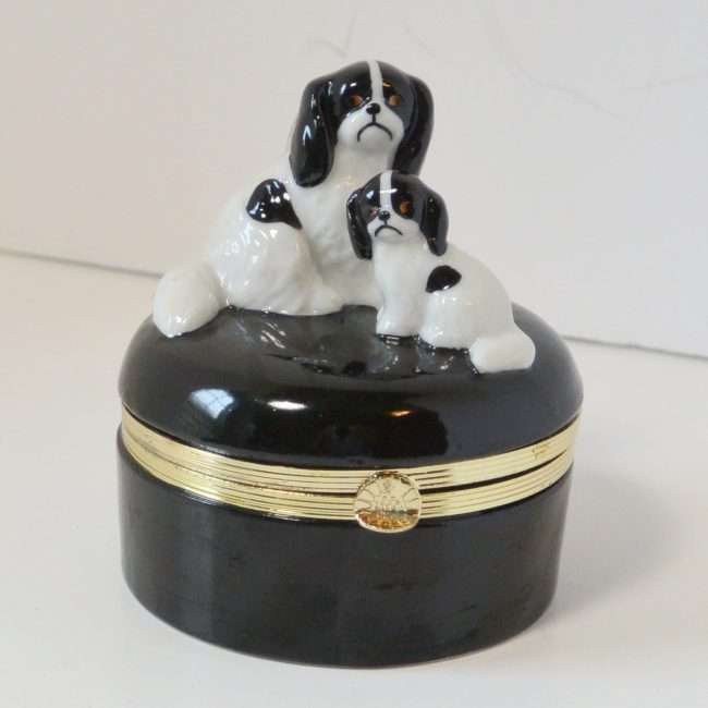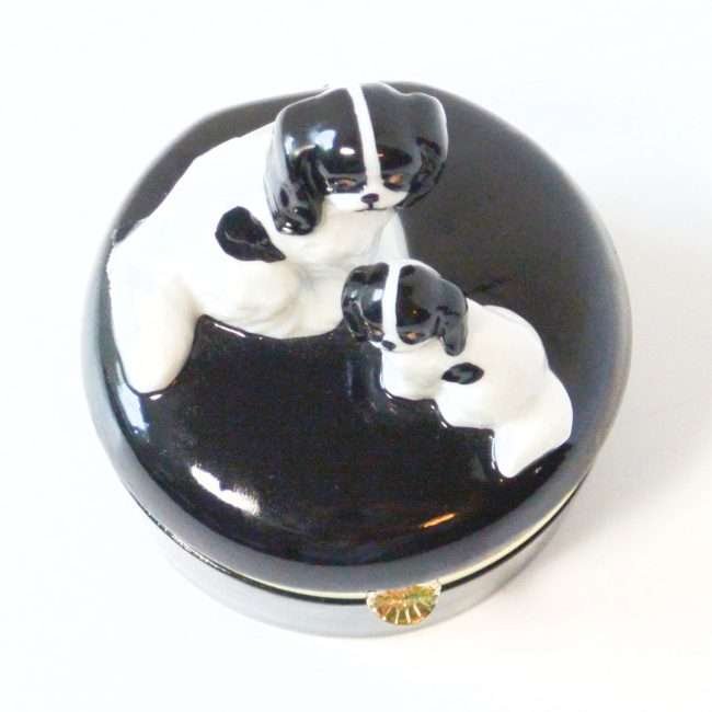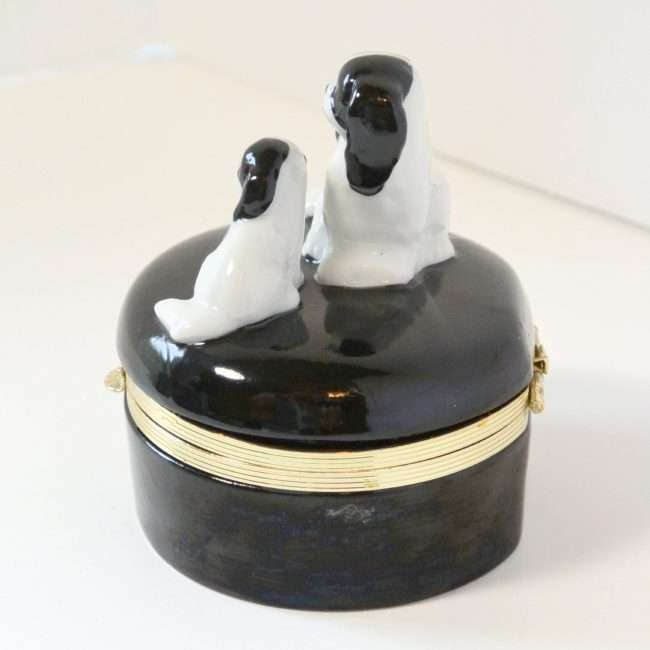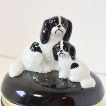 This vintage trinket box features a pair of Japanese Chin dogs.