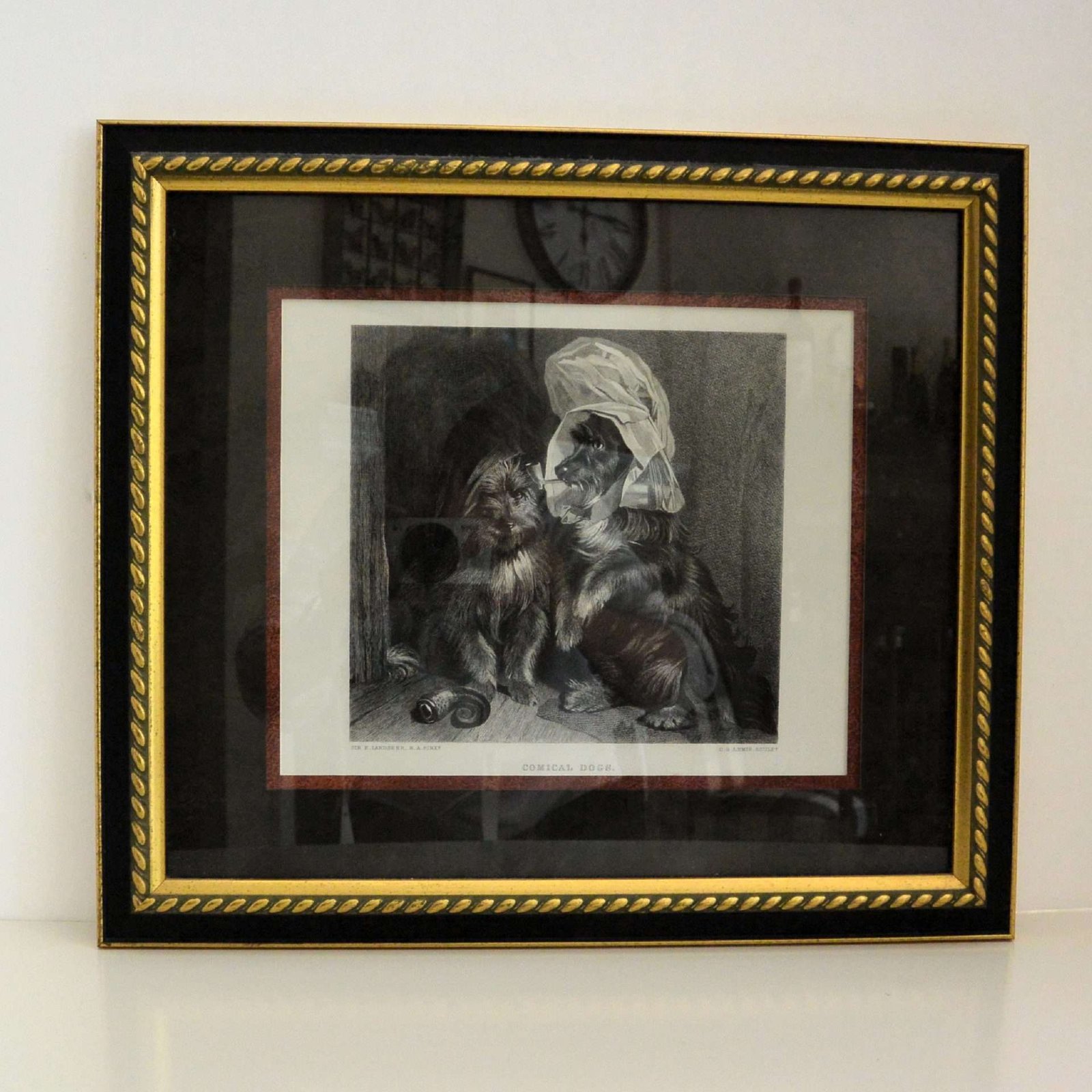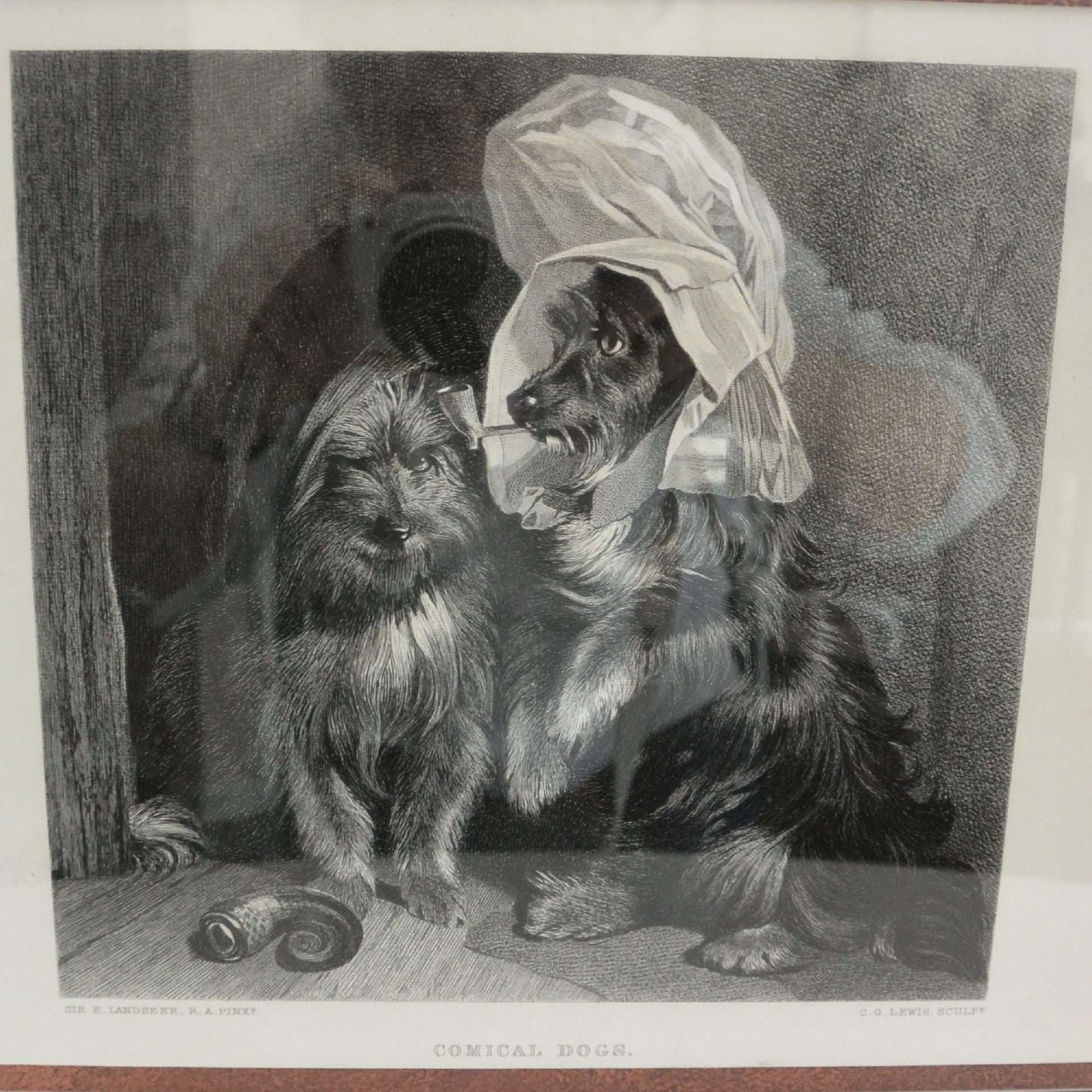 This well-known and popular painting, “Comical Dogs”. by Edwin Landseer, is exquisitely reproduced in this antique steel engraving by master engraver Charles George Lewis (1806-1880.)