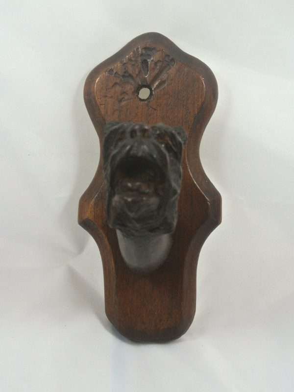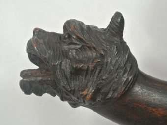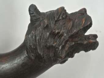 This magnificent hand carved, Black Forest Terrier head hook might have once been used as a whip hook, or one half of a gun rack. The detailing of this dog’s head is extraordinary! You can see fur lines, and an open mouth, showing teeth and the dog’s tongue. He has glass inset eyes that look almost real. See full details below.