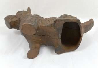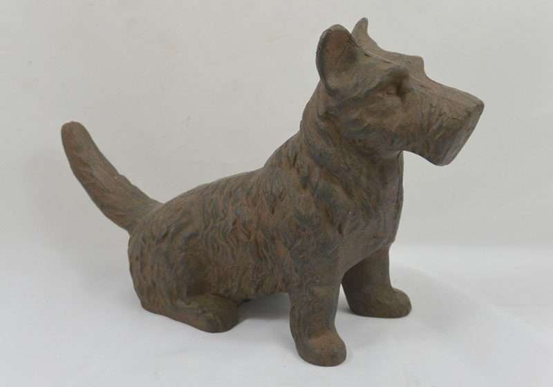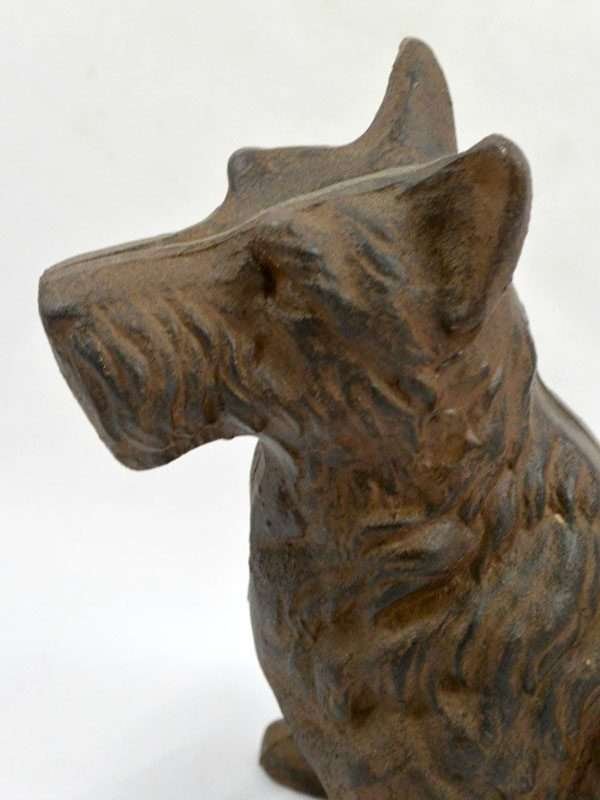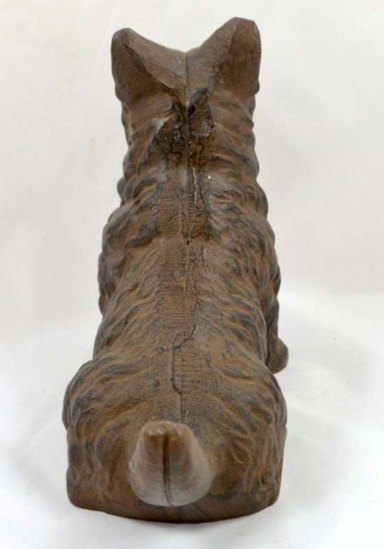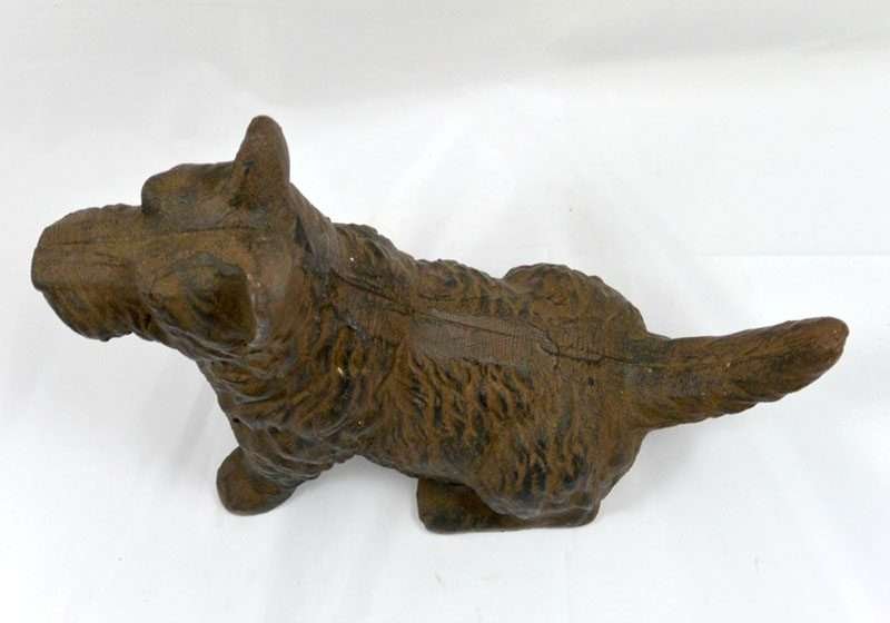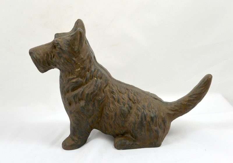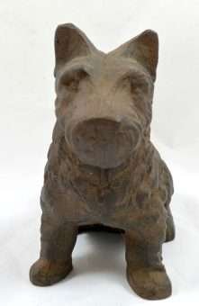 Beautiful detailing shows all over this substantial, cast iron Scottish Terrier figure. He has a vintage rust finish and sits 7″ tall x 10 1/2″ long x 4″ wide. Sitting so attentively, he would make the perfect “guard dog” doorstop, or a wonderful porch or garden figure.