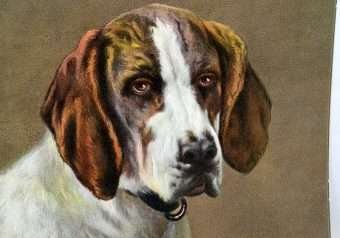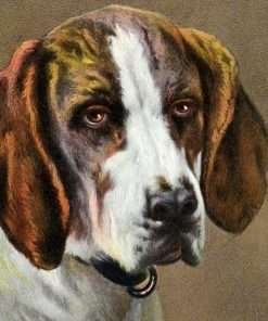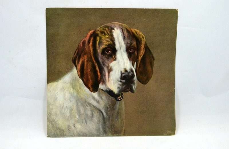 The detail in this antique portrait of a Fox Hound is truly extraordinary, from the perfect coloration and fur lines to the “twinkle” in his eyes! This limited edition, 8″ x 8″ chromolithograph was published by Muller Luchsinger & Co. in 1902.