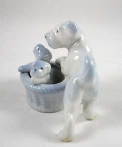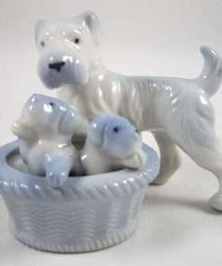 This petite figurine shows a mother terrier standing on three legs with the fourth leg draped on the back of a basket holding two of the sweetest puppies! This figurine moves from white to subtle shades of blue which makes it look even more precious. See full details below.