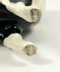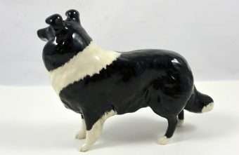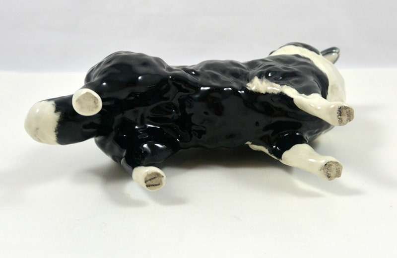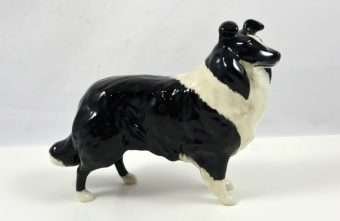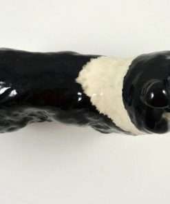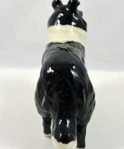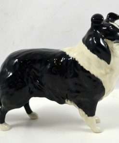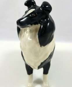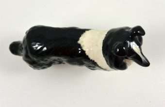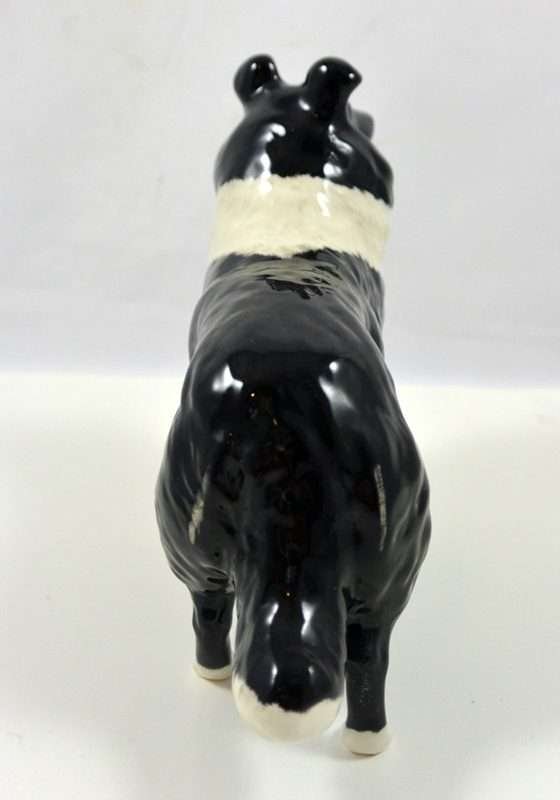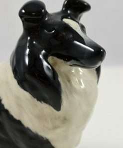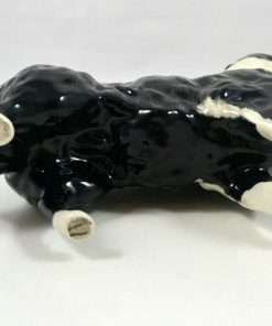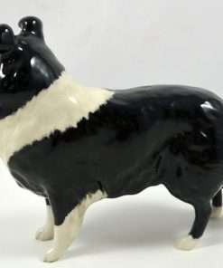 A wonderful study in black & white, this elegant Collie stands like a champion at 5 1/4″ tall x 6 1/2″ long x 2 1/2″ wide. Made in Beswick England and designed by Arthur Gredington, it carries the Beswick stamp on the underside of the two front paws. She has a beautiful, high gloss finish and she is in excellent condition.