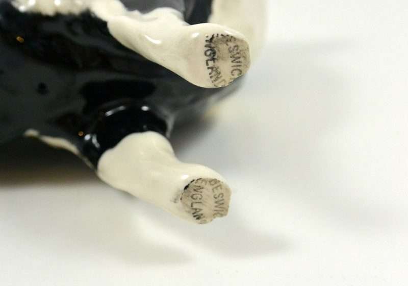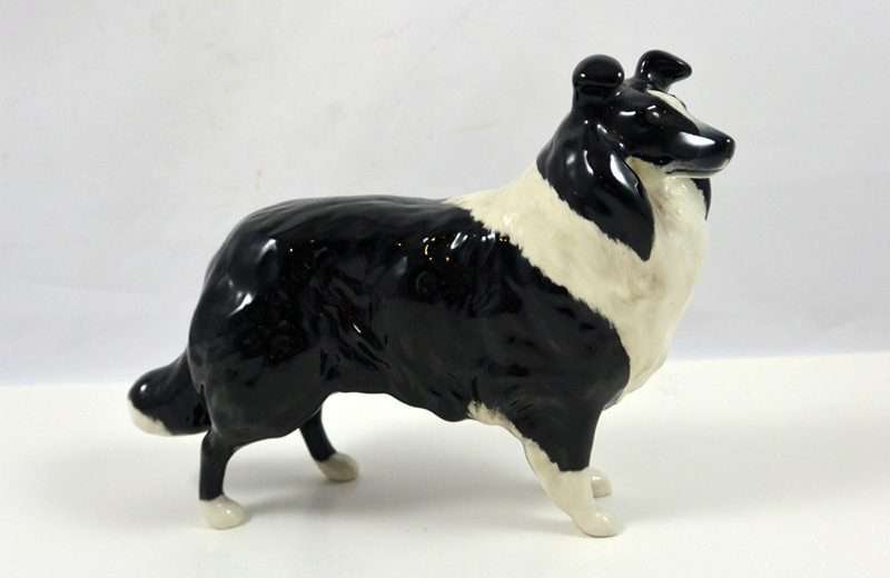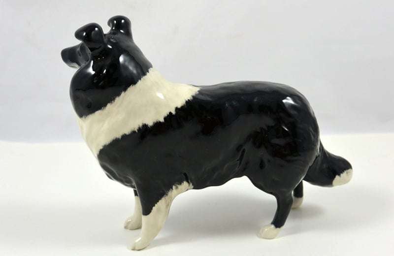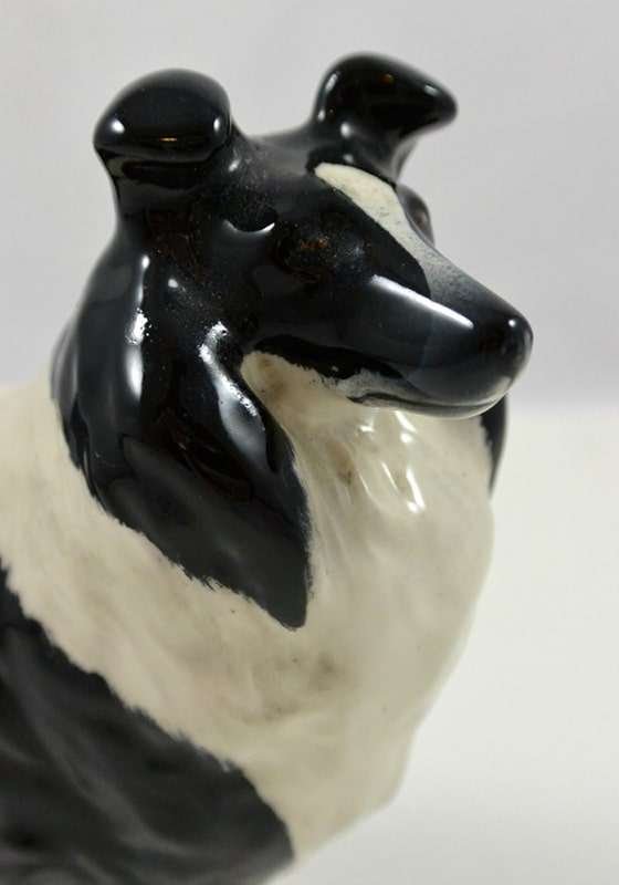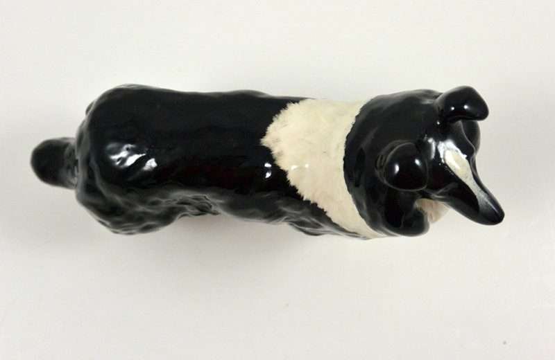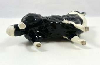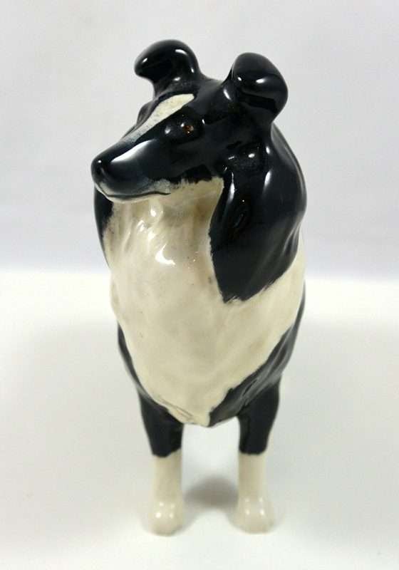 A wonderful study in black & white, this elegant Collie stands like a champion at 5 1/4″ tall x 6 1/2″ long x 2 1/2″ wide. Made in Beswick England and designed by Arthur Gredington, it carries the Beswick stamp on the underside of the two front paws. She has a beautiful, high gloss finish and she is in excellent condition. This gorgeous dog would look wonderful displayed on her own. We discovered her in an estate display of canine collectibles…all in black & white. Imagine this beauty as the start of a fantastic “Black & White” canine collection of your own!