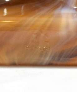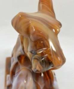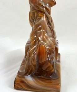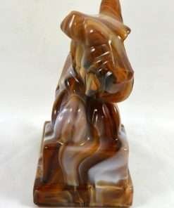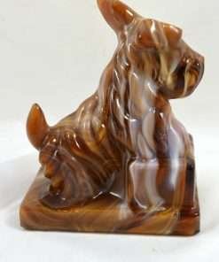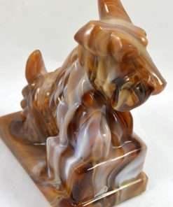“Stunning” is the appropriate word to describe this large Scottish Terrier dog designed in chocolate slag glass! Deep chocolate, caramel, milk chocolate and white glass swirl in a gorgeous mixture to create this uniquely beautiful dog. For those of you who collect either slag glass or Scottish Terriers, it is important to note that this particular piece is marked with the “ALIG” mark, indicating that it was made only between the years 1981-1983, during the time that the Imperial Glass company was owned by Arthur Lorch. 6 1/2″ tall x 5″ long x 3″ wide, this fascinating, 3-dimensional dog would make a beautiful stand alone piece, or an exquisite bookend. Be sure to look closely at how the colors and “carved” look of the glass combine to make this such a gorgeous work of art!