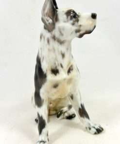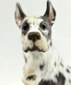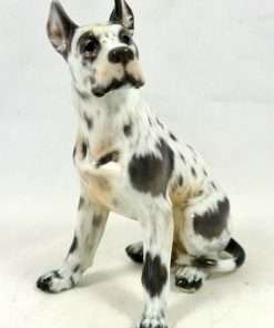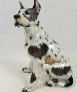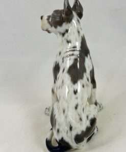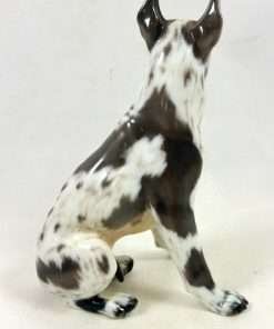 As with all Dahl-Jensen canines, this Harlequin Great Dane is perfect in every way. Created by Jens Peter Dahl-Jensen (1874-1960), it is marked #1128 with the Dahl-Jensen stamp. Sitting proudly at 5 1/4″ tall x 3 1/4″ long x 2 3/4″ wide, this elegant pup looks so real, you can’t help but want to touch him. Such realism, combined with Dahl-Jensen’s signature, soft color palette, places this vintage porcelain figurine in a class all its own. He is in excellent condition, and you can find him on page 57 of “Dahl-Jensen Porcelain Figurines 1897-1985” by Caroline and Nick Pope.