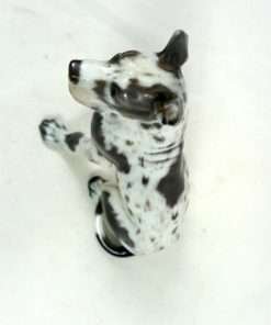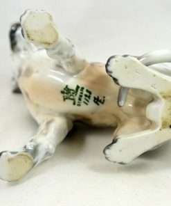 As with all Dahl-Jensen canines, this Harlequin Great Dane is perfect in every way. Created by Jens Peter Dahl-Jensen (1874-1960), it is marked #1128 with the Dahl-Jensen stamp. Sitting proudly at 5 1/4″ tall x 3 1/4″ long x 2 3/4″ wide, this elegant pup looks so real, you can’t help but want to touch him.