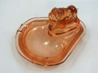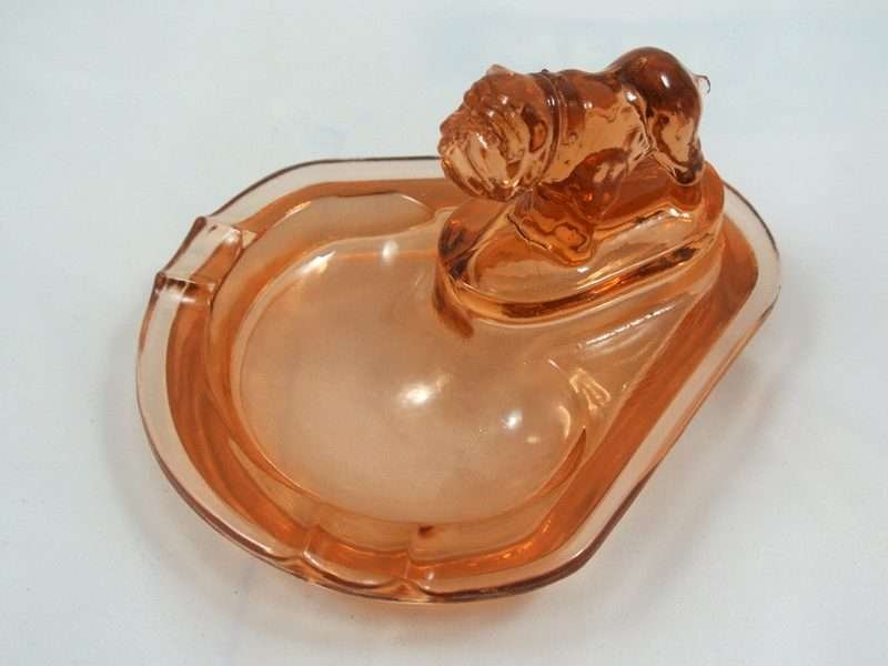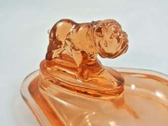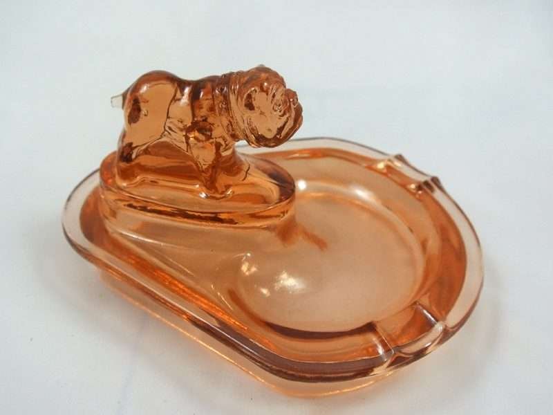 This small Bulldog perches proudly at the end of what is called a “Pink” Depression Glass ashtray. However, it is not really pink, but rather a “peachy” coral color. The bulldog has wonderful detailing. See full details below.