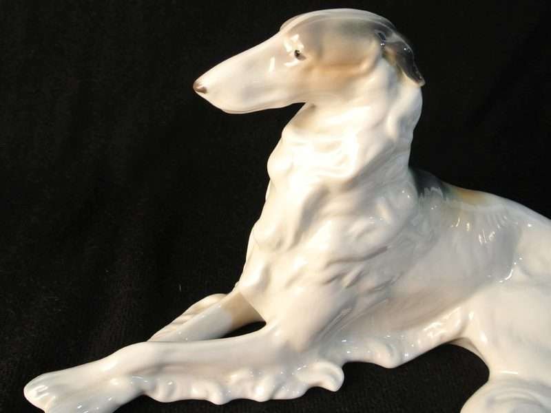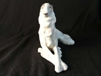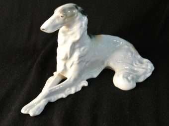 This beautiful porcelain Borzoi has a high gloss finish and it is lying with it’s front legs elegantly crossed. Mostly a creamy white with touches of soft gray and tan on the head, ears and back. In excellent condition. See full details below.
