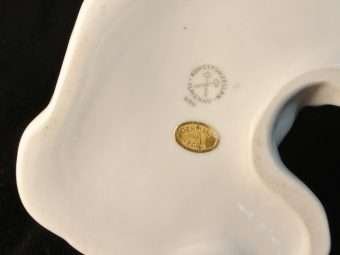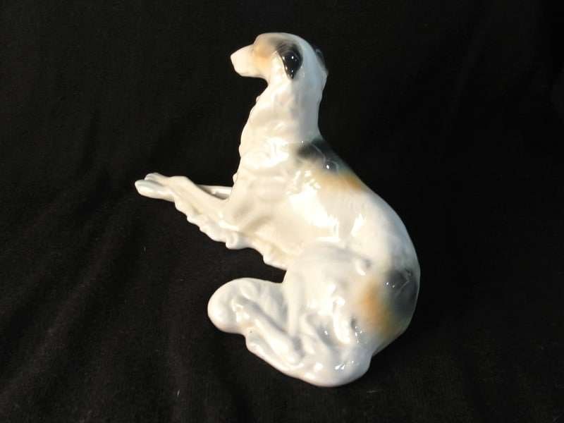 This beautiful porcelain Borzoi has a high gloss finish and it is lying with it’s front legs elegantly crossed. Mostly a creamy white with touches of soft gray and tan on the head, ears and back. In excellent condition, it is marked with the Kunst Porzellan Ilmenau hallmark, with GDR below (German Democratic Republic) and it has a gold sticker which reads “Germany East” also on the bottom of this figurine. This lovely dog will add a touch of elegance to any room. A GORGEOUS gift for someone very special, and a “must-have” addition to any Borzoi collection.
