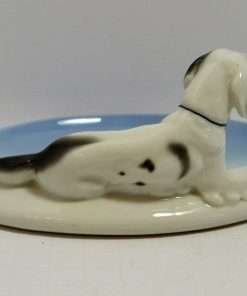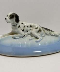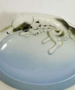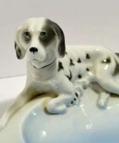 “Elegant” would be the best word to describe this beautiful sky blue and white, porcelain trinket dish, adorned by a reclining English Setter dog. It is in mint condition at 6 5/8″ long x 4 7/8″ wide. The dog is 2 1/4″ tall x 5 7/8″ long, and is wonderfully detailed with flowing fur lines, and deep set, expressive eyes.