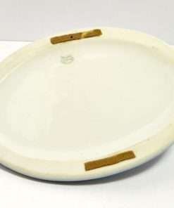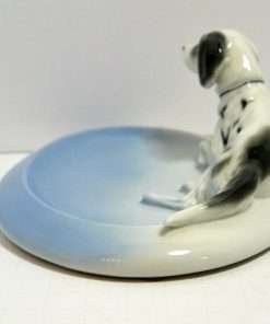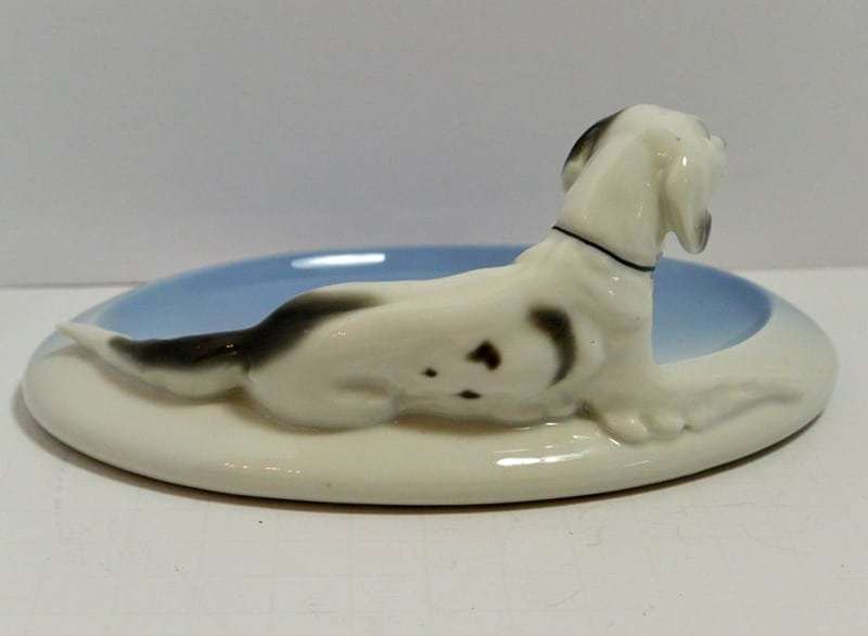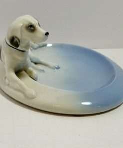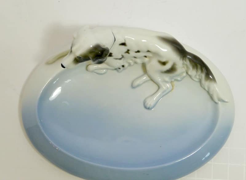 “Elegant” would be the best word to describe this beautiful sky blue and white, porcelain trinket dish, adorned by a reclining English Setter dog. It is in mint condition at 6 5/8″ long x 4 7/8″ wide. The dog is 2 1/4″ tall x 5 7/8″ long, and is wonderfully detailed with flowing fur lines, and deep set, expressive eyes. It was made in Germany in the Fr. Pfeffer Porcelain factory between 1900 and 1934. It is not only a gorgeous collectible piece, but also one that could be put to good use as a coin or trinket tray, a desk tray, or even an elegant and unique soap dish! This is absolutely a gift that any dog-loving hostess, or friend would treasure.