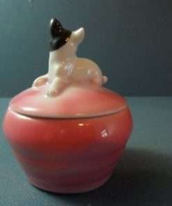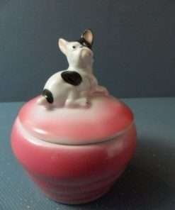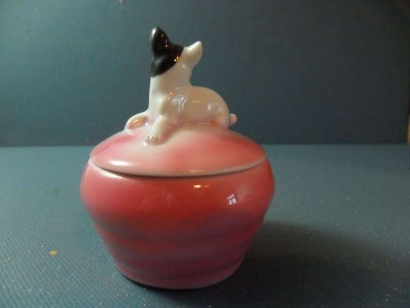This hand painted porcelain box has a sweet french bulldog perched right on top! It carries the Carl Schneider German porcelain mark on the bottom. It is also numbered 6237. Very old and very precious! See full details below.